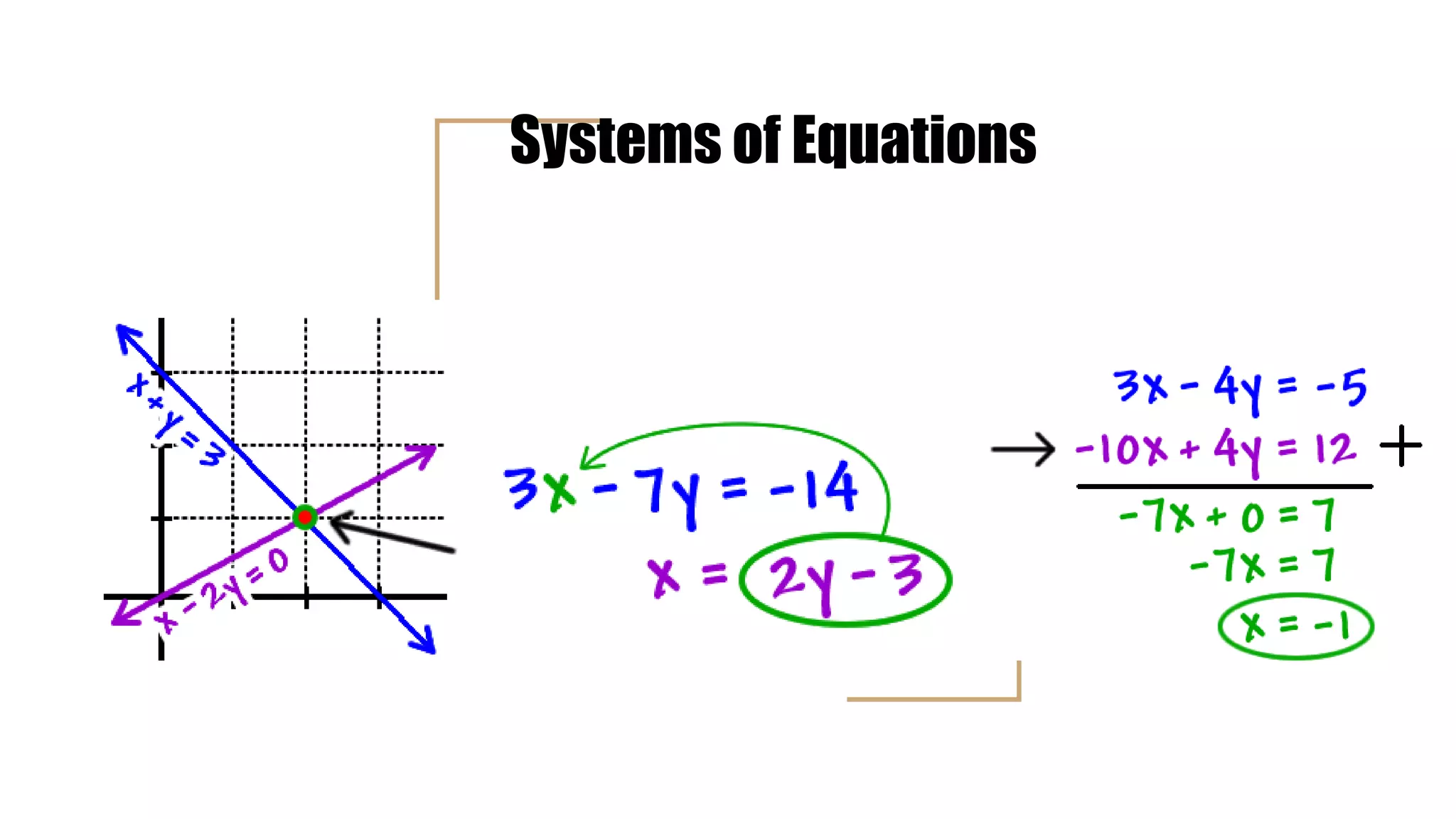This document discusses three methods for solving systems of equations: graphing, substitution, and elimination. The graphing method involves finding the intersection of two graphs. Substitution involves rewriting one variable in terms of the other. Elimination involves canceling out a variable by making coefficients of that variable equal between equations. While substitution and elimination work best when equations are already in a certain form, any method can be used to solve systems as needed by manipulating the equations.
