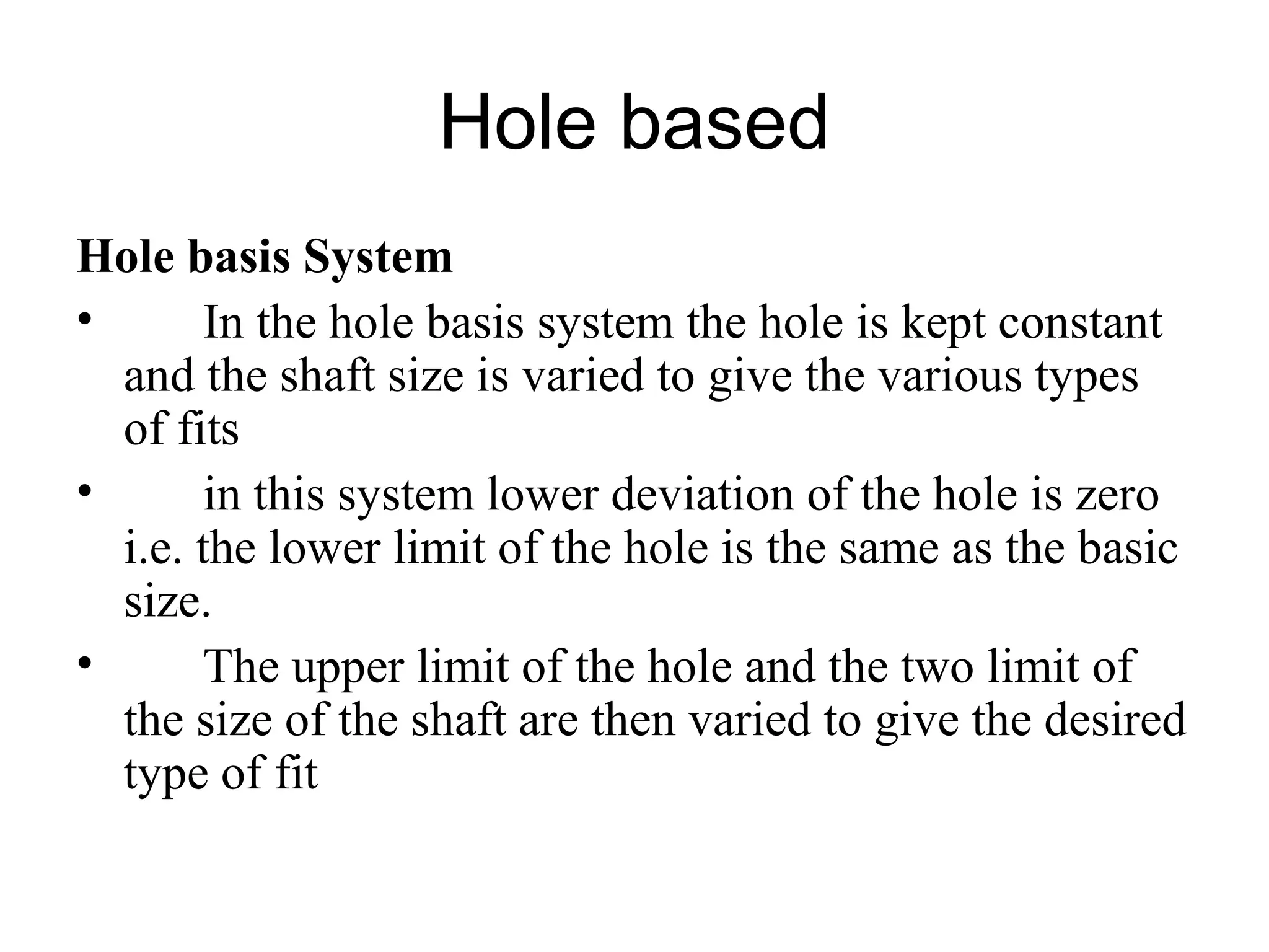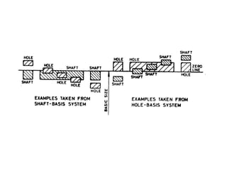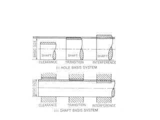This document discusses different systems of fit for shafts and holes, types of gauges, and gauge tolerances. It describes two systems - the hole basis system where the hole size is fixed and the shaft is varied, and the shaft basis system where the shaft is fixed and the hole is varied. It also outlines different types of gauges like standard, limit, workshop, and inspection gauges. Limit gauges in particular have two ends, one for maximum and one for minimum limits. The document concludes by noting that gauges have tolerances to account for manufacturing imperfections, and that unilateral tolerances are preferred.