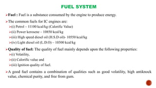 The document discusses the fuel system of internal combustion (IC) engines. It describes the key components and functions of the fuel system in diesel engines, including the fuel filter, fuel injection pump, fuel injector, combustion chamber, turbocharger, and governor. It also briefly discusses the fuel supply system in spark ignition engines. The fuel system's purpose is to supply clean fuel to the engine cylinders so it can be combusted to produce energy to run the engine.