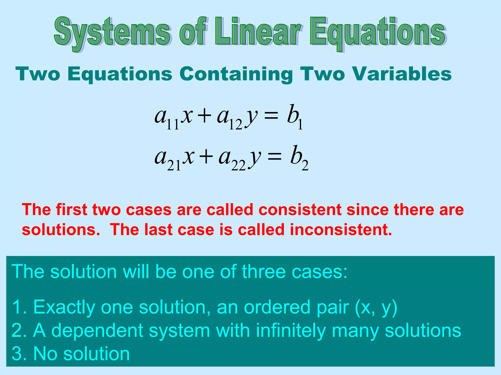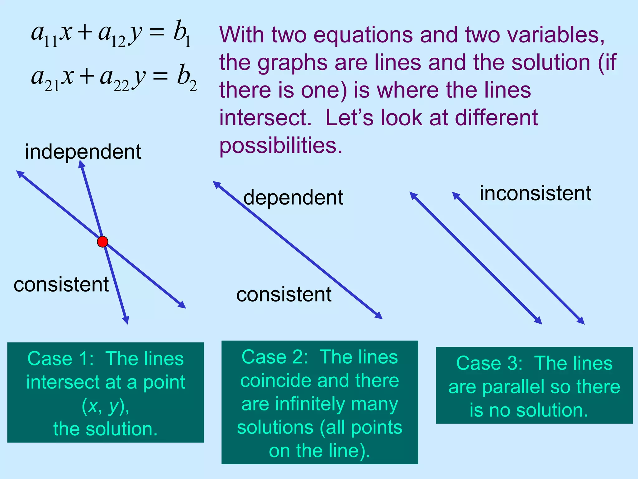 The document discusses solving systems of linear equations with two or three variables. There are three possible cases for the solution: 1) a unique solution, 2) infinitely many solutions (a dependent system), or 3) no solution. The document demonstrates solving systems using substitution and elimination methods, and provides examples of each case. Graphically, case 1 corresponds to intersecting lines or planes, case 2 to coinciding lines or intersecting planes, and case 3 to parallel lines or non-intersecting planes.