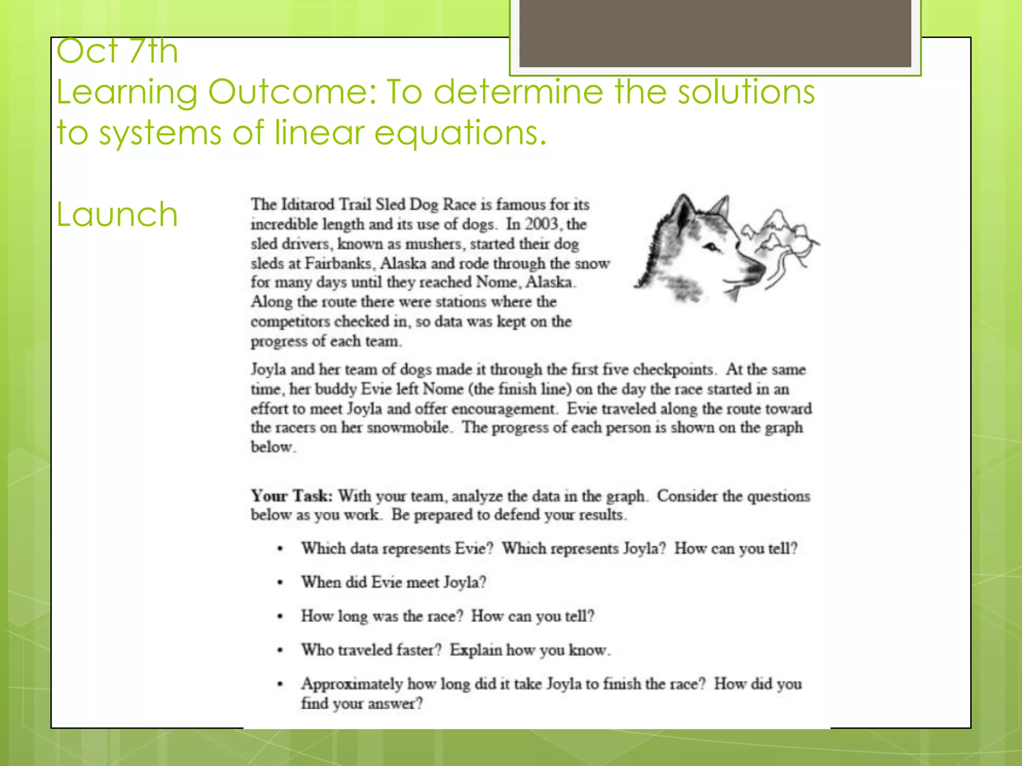 Students will learn to determine solutions to systems of linear equations. The lesson will begin with an introduction and launch activity to engage students. Students will then explore systems of linear equations through an investigation activity.