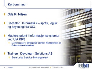 COPYRIGHT© Kort om meg Oda R. Nilsen Bachelor i Informatikk – språk, logikk og psykologi fra UiO Masterstudent i Informasjonssystemer ved UiA KRS Masteroppgave: Enterprise Content Management og Enterprise Architecture Trainee i Devoteam Solutions AS Enterprise Service Management 2 12/04/2012