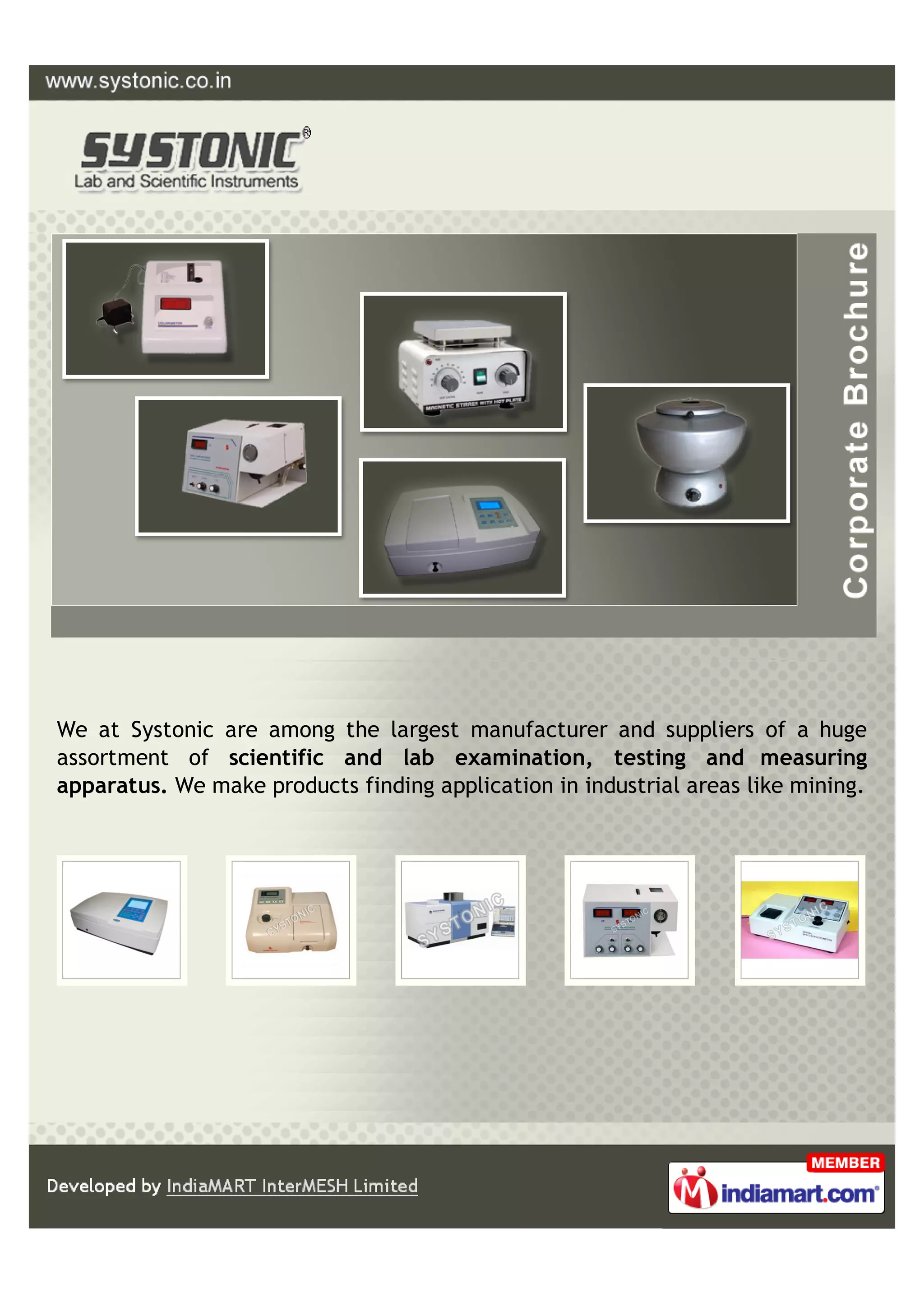 Systonic is an ISO 9001:2008 certified company established in 2009 that manufactures and exports a wide range of analytical and scientific laboratory instruments. Their product offerings include spectrophotometers, conductivity meters, pH meters, and various other laboratory equipment, catering to both domestic and international markets. The company, guided by Mr. Sanjay Saini, prides itself on high-quality production and customer trust.
