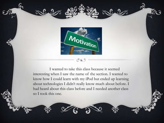 The student took the class because it seemed interesting when they saw the name. They wanted to learn how to use their iPod for learning but ended up learning about new technologies. They chose the Learning Warrior path because they wanted to learn new technologies and weren't familiar with many of the technologies being taught. They believe the activities helped them work through the path by learning tools like podcasts, iPads, and screen casting that they were able to use in and after school.
