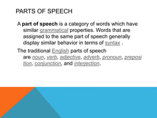 Parts of speech are categories of words with similar grammatical properties. The traditional English parts of speech are noun, verb, adjective, adverb, pronoun, preposition, conjunction, and interjection. Adjectives describe nouns or pronouns, verbs show actions, and nouns name places, people and events such as Valentine's Day.