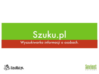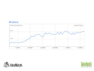 Szuku.pl 1. 2. 3. 4. 5. 6. 7. 8. 9. 10. 11. 12. 13. 14. 15. 16. 17. 18. 19. 20. 21. Czemu się dostaliśmy Działające demo Dobre wyczucie czasu Temat na topie (“Semantic Search”) Potencjalnie duże perspektywy Przyzwoity zespół (doświadczenie) 22. 23. 24. Pitching "Start by saying that you're from Poland: people have heard about nasza-klasa and gadu-gadu, they know that Poland may have a billion dollar exit" 25. Pitching "At this (pre-seed) stage noone cares about details of PR, or market size. Prove to them that there will be a value added" 26. 27. Czemu odpadliśmy Duża konkurencja na rynku Produkt tylko w polskiej wersji Brak dowodu jakości algorytmu (PhDs) 28. 29. 30. 31. 32. 33. 34. 35. 36. API Dla innych (widget na stronach) Od innych (źródła danych) Ekstra usługi płatne Programiści Szutcznej Inteligencji 37.