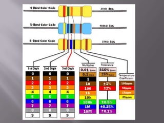 This document provides information on basic electronic components including resistors, capacitors, inductors, transformers, transistors, and diodes. It describes what each component is, how it works, common symbols and values. Specifically, it outlines that resistors restrict current flow and are measured in ohms, capacitors store electrical energy and are measured in farads, and inductors store magnetic energy and are measured in henries. Color codes for resistors and tolerance codes for capacitors are also provided.