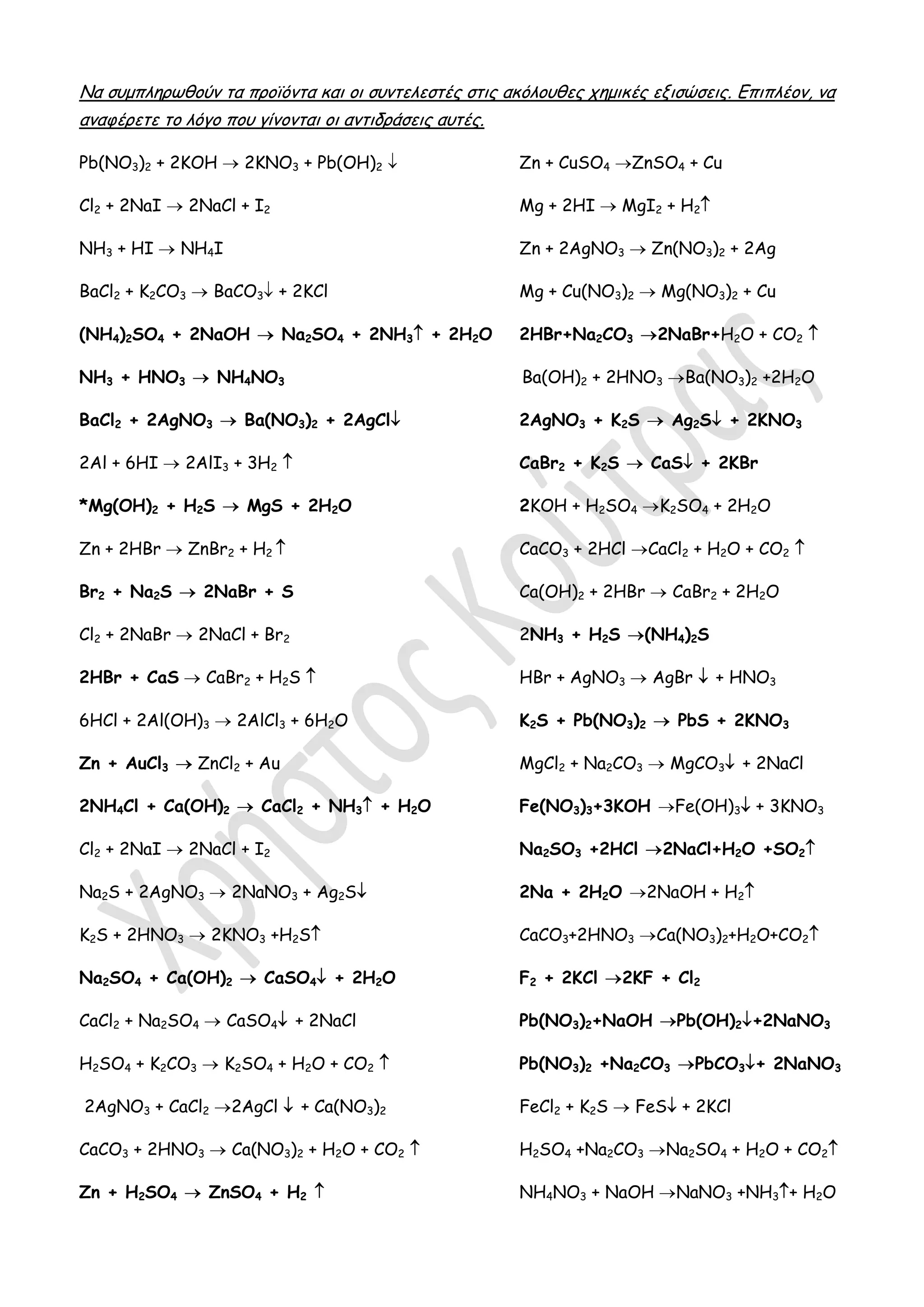 προϊόντα και οι συντελεστές στις ακόλουθες χημικές εξισώσεις. Eπιπλέον, να αναφέρετε το λόγο που γίνονται οι αντιδράσεις αυτές. Pb(NO3)2 + 2KOH 2KNO3 + Pb(OH)2 Zn + CuSO4 ZnSO4 + Cu Cl2 + 2NaI 2NaCl + I2 Mg + 2HI MgI2 + H2 NH3 + HI NH4I Zn + 2AgNO3 Zn(NO3)2 + 2Ag BaCl2 + K2CO3 BaCO3 + 2KCl Mg + Cu(NO3)2 Mg(NO3)2 + Cu (NH4)2SO4 + 2NaOH Na2SO4 + 2NH3 + 2H2O 2HBr+Na2CO3 2NaBr+H2O + CO2 NH3 + HNO3 NH4NO3 Ba(OH)2 + 2HNO3 Ba(NO3)2 +2H2O BaCl2 + 2AgNO3 Ba(NO3)2 + 2AgCl 2AgNO3 + Κ2S Ag2S + 2KNO3 2Al + 6HI 2AlI3 + 3H2 CaBr2 + K2S CaS + 2KBr *Mg(OH)2 + H2S MgS + 2H2O 2KOH + H2SO4 K2SO4 + 2H2O Zn + 2HBr ZnBr2 + H2 CaCO3 + 2HCl CaCl2 + H2O + CO2 Br2 + Na2S 2NaBr + S Ca(OH)2 + 2HBr CaBr2 + 2H2O Cl2 + 2NaBr 2NaCl + Br2 2NH3 + H2S (NH4)2S 2HBr + CaS CaBr2 + H2S HBr + AgNO3 AgBr + HNO3 6HCl + 2Al(OH)3 2AlCl3 + 6H2O K2S + Pb(NO3)2 PbS + 2KNO3 Zn + AuCl3 ZnCl2 + Au MgCl2 + Na2CO3 MgCO3 + 2NaCl 2NH4Cl + Ca(OH)2 CaCl2 + NH3 + H2O Fe(NO3)3+3KOH Fe(OH)3 + 3KNO3 Cl2 + 2NaI 2NaCl + I2 Na2SO3 +2HCl 2NaCl+H2O +SO2 Na2S + 2AgNO3 2NaNO3 + Ag2S 2Na + 2H2O 2NaOH + H2 K2S + 2HNO3 2KNO3 +H2S CaCO3+2HNO3 Ca(NO3)2+H2O+CO2 Na2SO4 + Ca(OH)2 CaSO4 + 2H2O F2 + 2KCl 2KF + Cl2 CaCl2 + Na2SO4 CaSO4 + 2NaCl Pb(NO3)2+NaOH Pb(OH)2 +2NaNO3 H2SO4 + K2CO3 K2SO4 + H2O + CO2 Pb(NO3)2 +Na2CO3 PbCO3 + 2NaNO3 2AgNO3 + CaCl2 2AgCl + Ca(NO3)2 FeCl2 + K2S FeS + 2KCl CaCO3 + 2HNO3 Ca(NO3)2 + H2O + CO2 H2SO4 +Na2CO3 Na2SO4 + H2O + CO2 Zn + H2SO4 ZnSO4 + H2 NH4NO3 + NaOH NaNO3 +NH3 + H2O