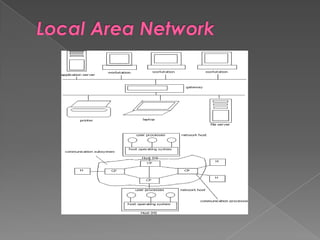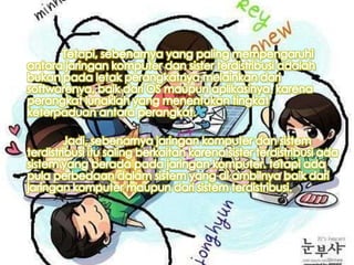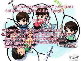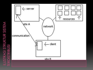 Dokumen tersebut memberikan informasi mengenai sistem terdistribusi dan jaringan komputer. Ringkasannya adalah sistem terdistribusi adalah sekumpulan prosesor yang terhubung melalui jaringan dan saling berbagi sumber daya, sedangkan jaringan komputer adalah kumpulan komputer yang terhubung untuk bertukar informasi. Perbedaan antara keduanya adalah sistem terdistribusi mencakup layer aplikasi hingga fisik sedangkan jaringan komputer hanya