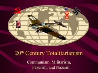 This document discusses the rise of totalitarian regimes in the early 20th century amidst worldwide economic depression and hardship. It outlines the policies and impacts of communist dictator Joseph Stalin in Russia, Emperor Hirohito in Japan pursuing military expansion, fascist dictator Benito Mussolini in Italy, and Nazi dictator Adolf Hitler in Germany. It also notes responses by other nations like the New Deal in the US and planned economies in Britain. In the end, the regimes of Hitler and Stalin led to World War II, which caused over 50 million military and civilian deaths worldwide before the defeat of Nazi Germany and Fascist Italy.