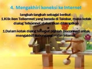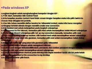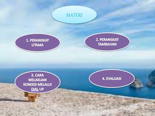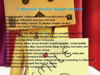 Dokumen ini menjelaskan perangkat keras yang diperlukan untuk mengakses internet, termasuk komputer, modem, dan jaringan telepon, serta fungsinya. Juga diuraikan spesifikasi teknis seperti RAM, prosesor, dan berbagai jenis modem, termasuk modem dial-up dan ADSL. Selain itu, dokumen membahas komponen pendukung seperti kabel, switch, dan router untuk membangun jaringan internet.