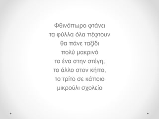 όλα πέφτουν θα πάνε ταξίδι πολύ μακρινό το ένα στην στέγη, το άλλο στον κήπο, το τρίτο σε κάποιο μικρούλι σχολείο