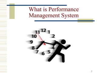 The document discusses performance management systems and performance appraisals. It defines performance as the degree of accomplishment of job tasks. Performance is determined by effort, abilities, and role perceptions. Effective performance management systems include regular performance appraisals that provide feedback, set improvement goals, and inform decisions like promotions. Several appraisal methods are described, like management by objectives and 360-degree feedback, with their strengths and weaknesses. Common errors in appraisals like leniency and halo effects are also outlined.