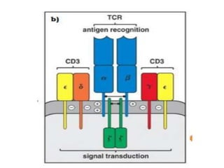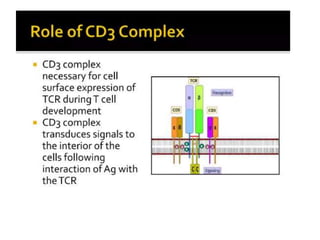 The T cell receptor (TCR) is a protein complex found on the surface of T cells that is responsible for recognizing fragments of antigen bound to MHC molecules. It consists of an alpha and beta chain, with 95% of T cells containing these chains and 5% containing gamma and delta chains instead. Each chain contains a variable region that binds the peptide-MHC complex and a constant region near the cell membrane. The variable regions contain three hypervariable complementarity-determining regions important for antigen recognition. The TCR is associated with CD3 proteins that transmit activation signals into the T cell upon peptide binding. TCR diversity arises from genetic recombination of DNA segments during T cell development.