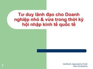 Tài liệu trình bày những lo sợ của người lãnh đạo và đặc điểm nổi bật của người Việt, từ đó đề xuất 21 bí quyết để nâng cao năng lực lãnh đạo. Các kỹ năng quan trọng như giao việc, phân quyền, giải quyết mâu thuẫn và động viên tinh thần cũng được liệt kê. Tài liệu nhấn mạnh sự cần thiết của quyết tâm, tổ chức và phát triển mục tiêu rõ ràng trong việc lãnh đạo doanh nghiệp nhỏ và vừa.