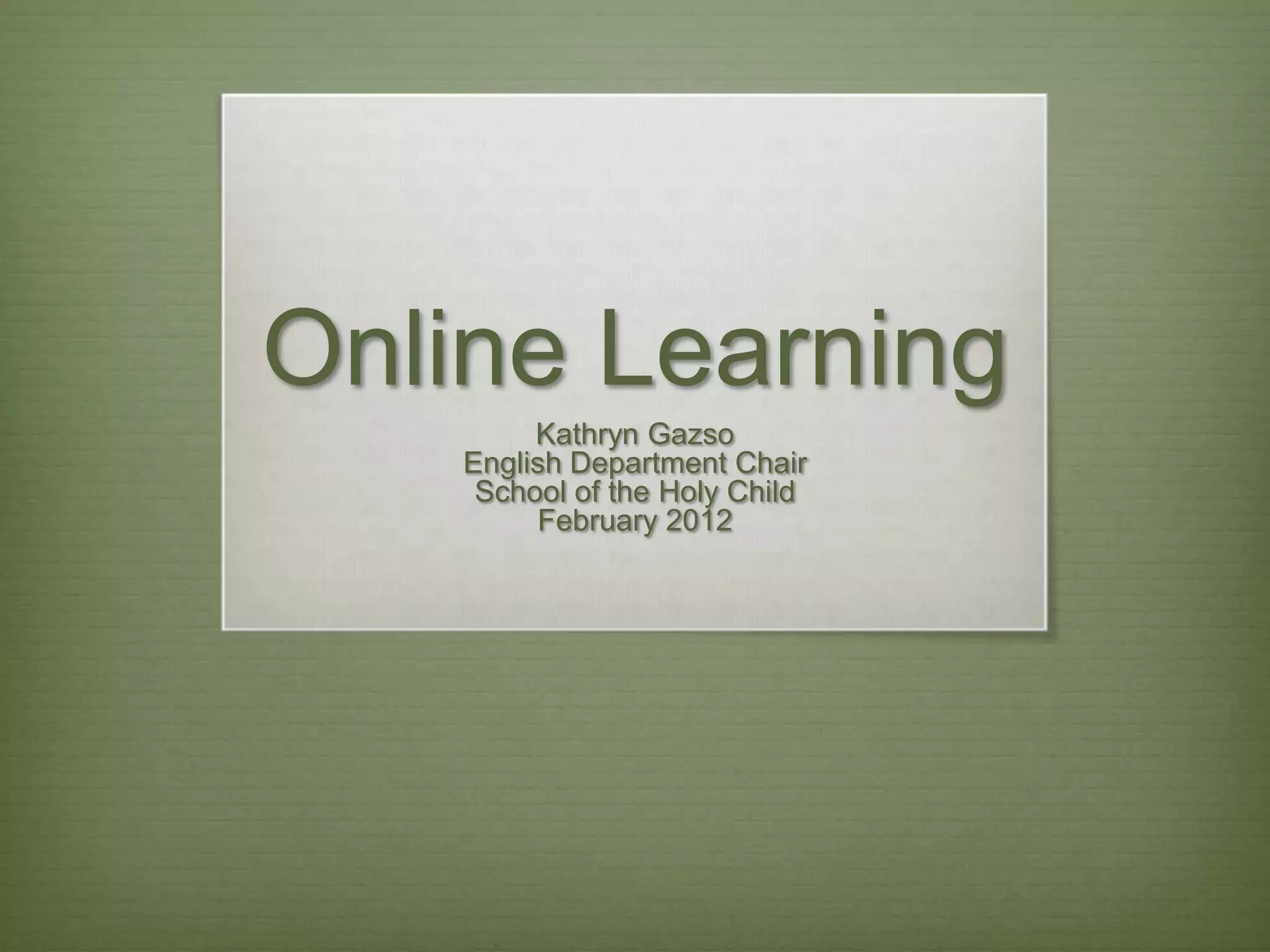This document discusses online learning and the design of online courses. It provides definitions of different types of online courses and statistics on trends in online enrollment. Independent schools are increasingly offering online and blended courses for reasons like enrichment, preparing students for online college courses, and providing access to courses the school cannot offer otherwise. The document outlines challenges in designing online courses like creating discussions without in-person interaction and utilizing technology to enhance content rather than be the focus. It provides examples of how one teacher designed her online "Madness in Literature" course, including use of a learning management system, online chats, projects, and discussions boards for assessments. The teacher learned the importance of timing, pacing, and using technology to further content rather than just