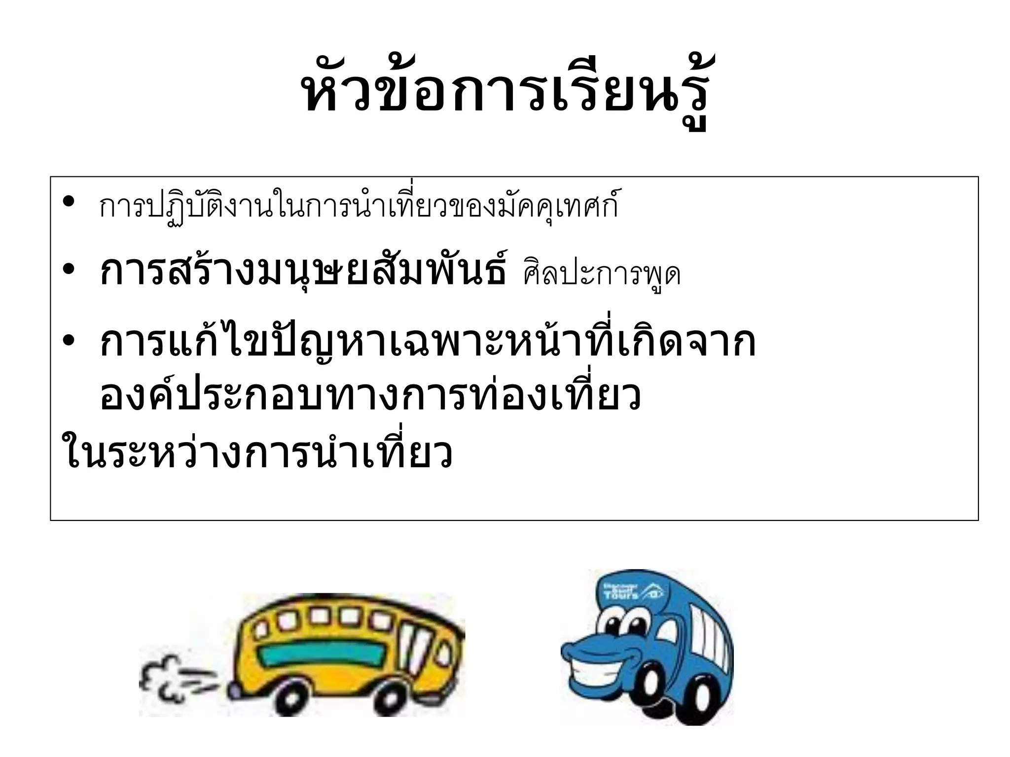•มัคคุเทศก์ควรตรวจสอบความเรียบร๎อยของรถ อุปกรณ์และสิ่งของ ตลอดจนพนักงานขับรถ 35. 4. การปฏิบัติหน้าที่ในระหว่างการเดินทาง