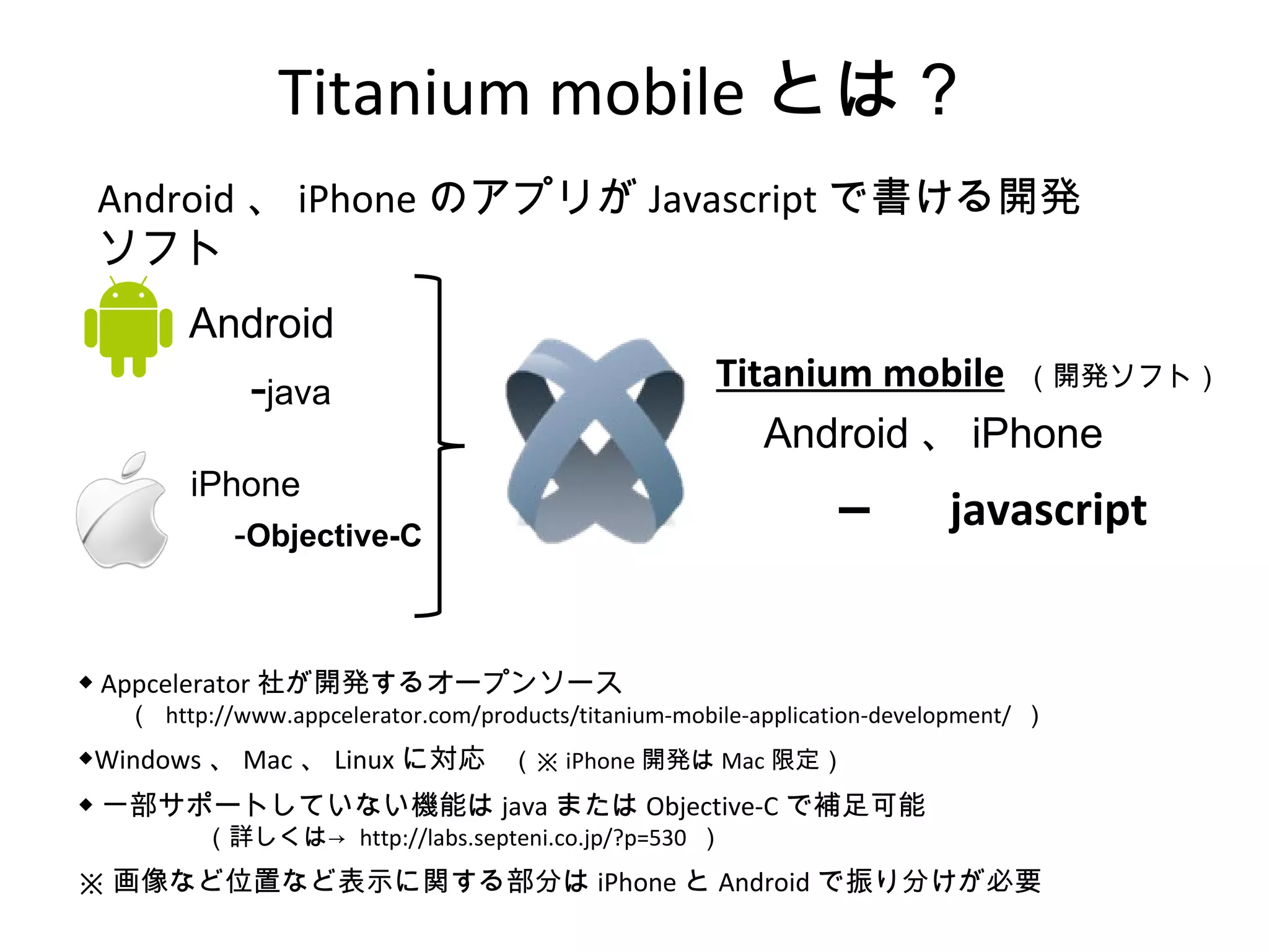 Titanium mobile とは?◆ Appcelerator 社が開発するオープンソース ( http://www.appcelerator.com/products/titanium-mobile-application-development/ ) ◆ Windows 、 Mac 、 Linux に対応 (※ iPhone 開発は Mac 限定) ◆ 一部サポートしていない機能は java または Objective-C で補足可能 (詳しくは-> http://labs.septeni.co.jp/?p=530 ) ※ 画像など位置など表示に関する部分は iPhone と Android で振り分けが必要 Android 、 iPhone のアプリが Javascript で書ける開発ソフト Android - java iPhone - Objective-C Titanium mobile (開発ソフト) Android 、 iPhone ― javascript - 2.