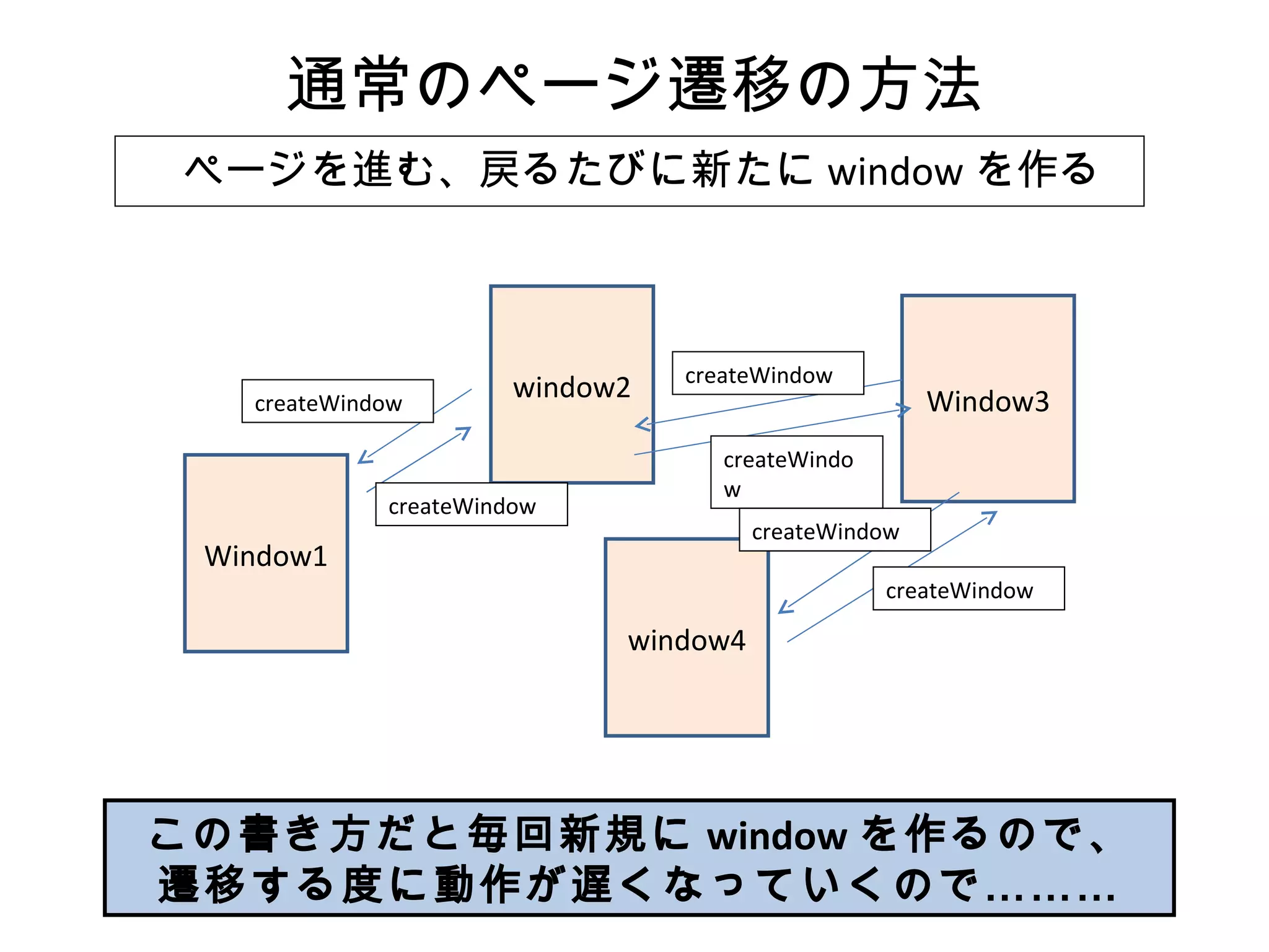 通常のページ遷移の方法 ページを進む、戻るたびに新たに windowを作る この書き方だと毎回新規に window を作るので、 遷移する度に動作が遅くなっていくので……… Window3 window2 window4 Window1 createWindow createWindow createWindow createWindow createWindow createWindow - 3.