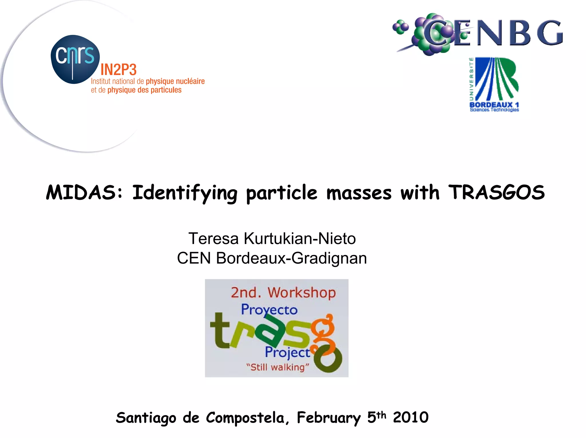 The document presents work on the MIDAS project which aims to identify particle masses using multiple sampling. It outlines results from initial MATLAB simulations showing electrons can be distinguished from muons and protons below 500 MeV. A Geant4 simulation using the SETA environment was also developed to model the TRASGO detector in more detail. Further simulations are needed but combining velocity, chi-squared values with additional information like timing may allow ambiguous particles to be discriminated.