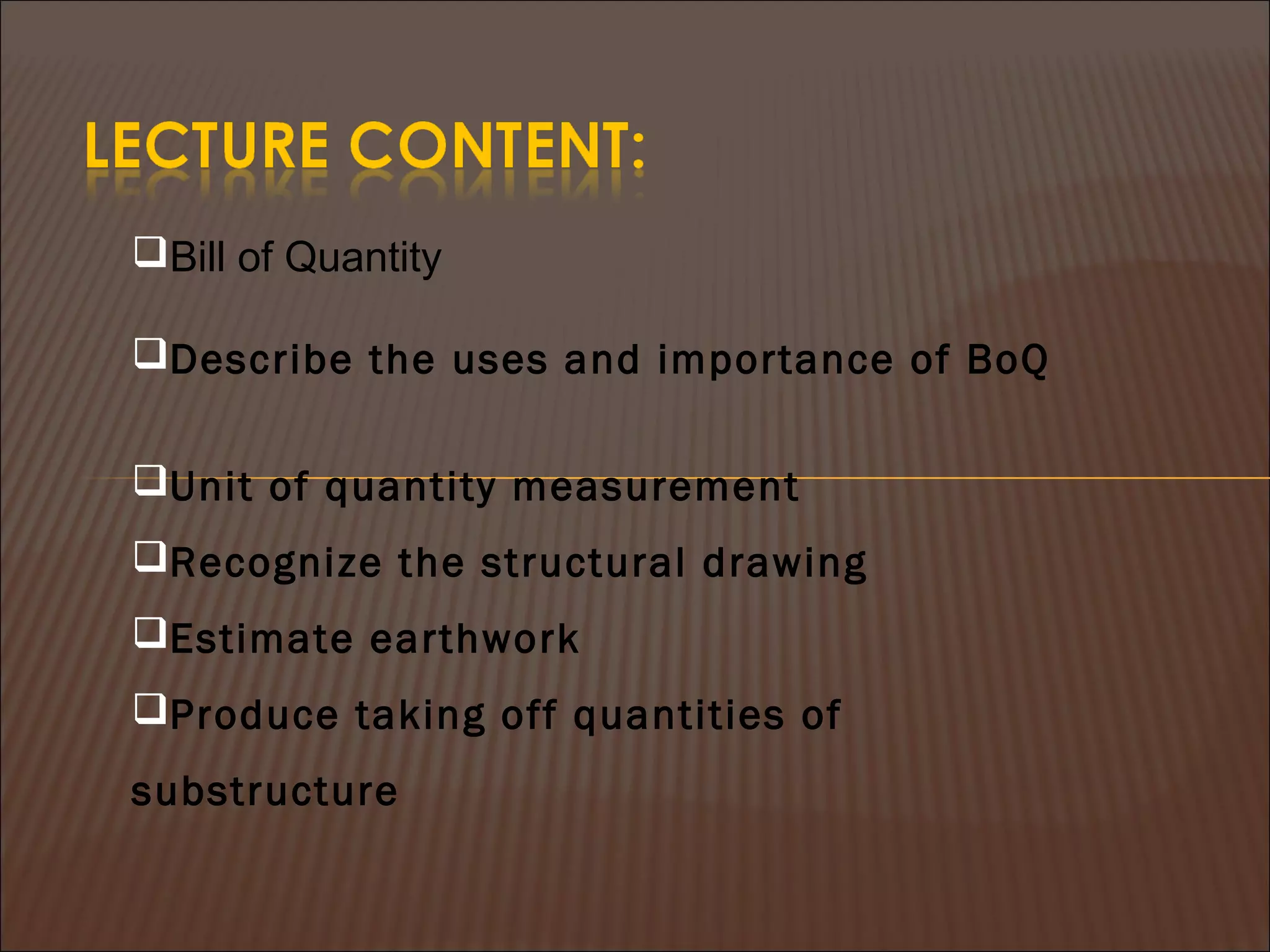 This document discusses quantity measurement in construction projects. It describes the importance of bills of quantities in costing, tendering, and valuing payment and variations. It explains the common units used to measure length, area, volume, weight, amounts, and items. It also defines structural drawings and their purpose in showing architectural and structural details. Finally, it outlines the key elements to take off quantities for substructures, such as piling, foundations, column stumps, ground beams, and ground slabs.