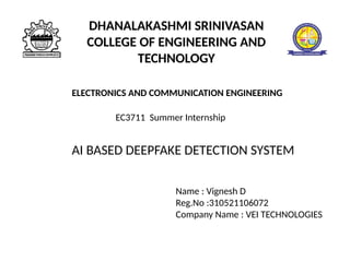 The document outlines a summer internship project at Dhanalakashmi Srinivasan College focusing on developing an AI-based deepfake detection system using advanced machine learning techniques. The project aims to accurately identify manipulated media to combat misinformation, enhance digital content integrity, and support applications in cybersecurity and media verification. It details the methodology, including data collection, preprocessing, feature extraction, model training, and performance evaluation, achieving a test accuracy of around 90% in detecting deepfakes.