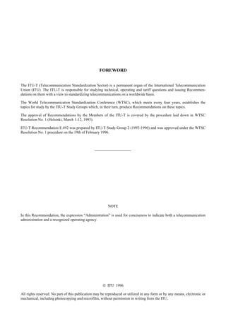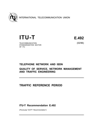 The document discusses traffic reference periods, which are time periods used for traffic observations related to quality control and network dimensioning. Normal and high load periods are defined to monitor grade of service. For circuit-switched networks, the normal load is the 4th highest daily peak period in a month, and the high load is the 2nd highest. Reference periods are also defined for different types of networks and services, such as public switched telephone networks, signaling system no. 7, and broadband ISDN. Measurement methods include continuous, scheduled, manual, and automatic collection of data.