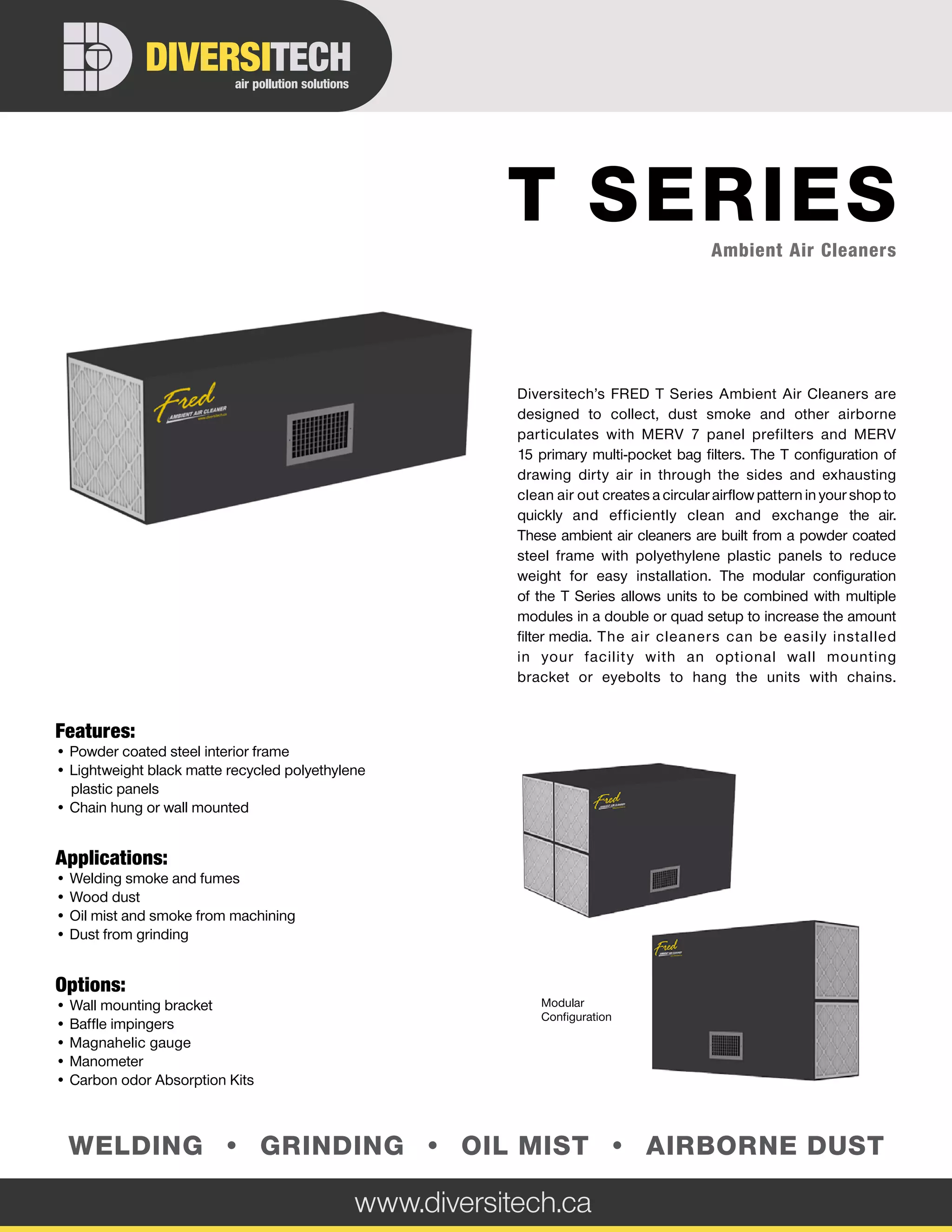 The T Series ambient air cleaners are modular units made of powder coated steel and plastic that can be wall mounted or chain hung. They use MERV 7 and MERV 15 filters to collect dust, smoke, and other particles from welding fumes, wood dust, oil mist, and grinding. The staggered, circular airflow pattern pulls dirty air in through the sides and exhausts clean air out the front.