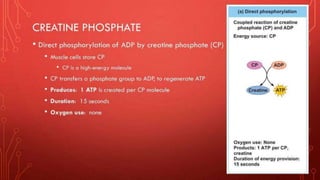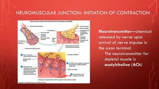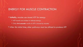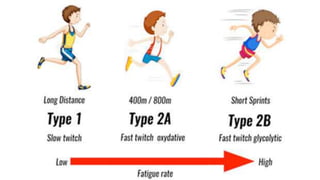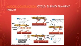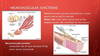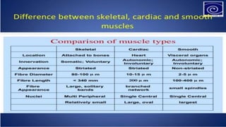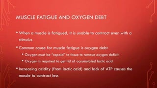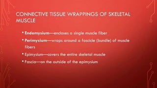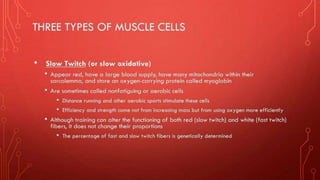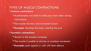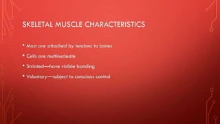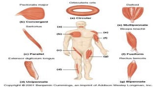 The document describes the different shapes that skeletal muscles can take: parallel or fusiform muscles which run parallel and contract over a great distance but lack strength; convergent muscles which maximize force by converging fibers on the insertion; pennate muscles which have many fibers per unit area and are strong but tire quickly, including unipennate, bipennate, and multipennate types; and circular muscles which surround openings and act as sphincters. Examples are provided for each type of muscle shape.