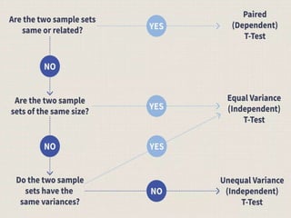 The document discusses the t-test, an inferential statistic developed by William Sealy Gosset under the pseudonym 'Student' in 1980, which is used to determine significant differences between the means of two variables. It covers various types of t-tests, including paired, independent, one-sample, one-tailed, and two-tailed tests, as well as the necessary calculations, including t-scores, p-values, and degrees of freedom. An example of the application of a t-test is provided, demonstrating how to determine if a restaurant's sales have increased after the establishment of a nearby bus stand.