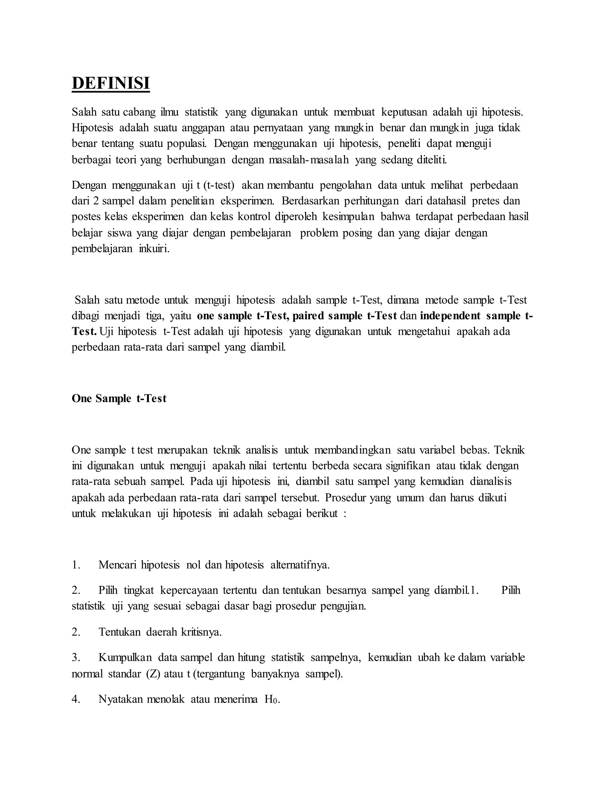 Uji hipotesis adalah metode dalam statistik untuk menguji pernyataan tentang populasi melalui analisis data. Metode ini termasuk one-sample t-test, paired-sample t-test, dan independent-sample t-test, yang masing-masing digunakan untuk membandingkan rata-rata antara satu atau lebih sampel. Hasil dari uji ini membantu peneliti menentukan signifikansi perbedaan antara kelompok yang dianalisis.