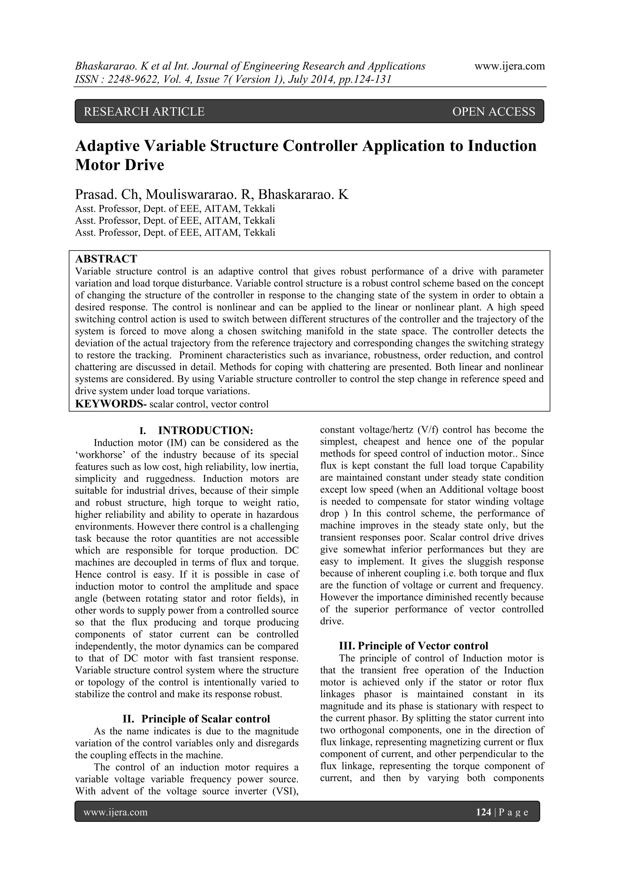 This document discusses the application of adaptive variable structure control in induction motor drives, emphasizing its robustness against parameter variations and load disturbances. It outlines the principles of scalar and vector control techniques, highlighting the advantages of vector control for achieving high dynamic performance akin to DC motors. Additionally, the design of adaptive variable structure controllers is examined, along with their effectiveness in handling complex trajectories for motors and robotic applications.