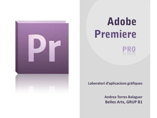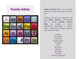 Família AdobeAdobePremiere Proés una aplicació destinada a l’edició de vídeo en temps real.Pertany al conjunt de programes del grup Adobe Systems, concretament dins la família d’AdobeCreative Suite, que engloba un conjunt d’aplicacions destinades al disseny gràfic, tractament d’imatge, pàgines web, edició de vídeo:Acrobat After Effects Contribute Dreamweaver Fireworks Flash Illustrator InDesignPhotoshop PremiereAdobe Soundbooth