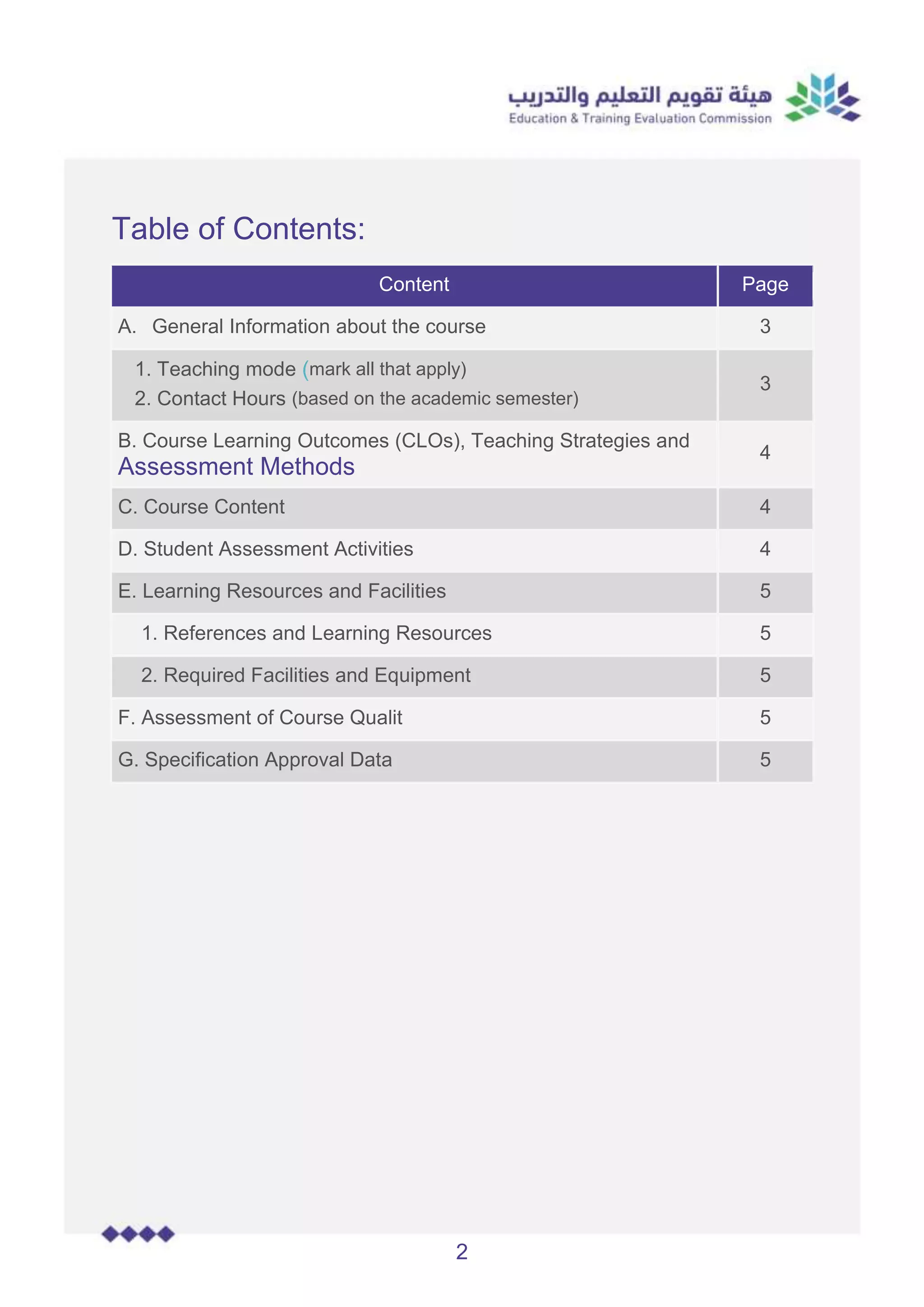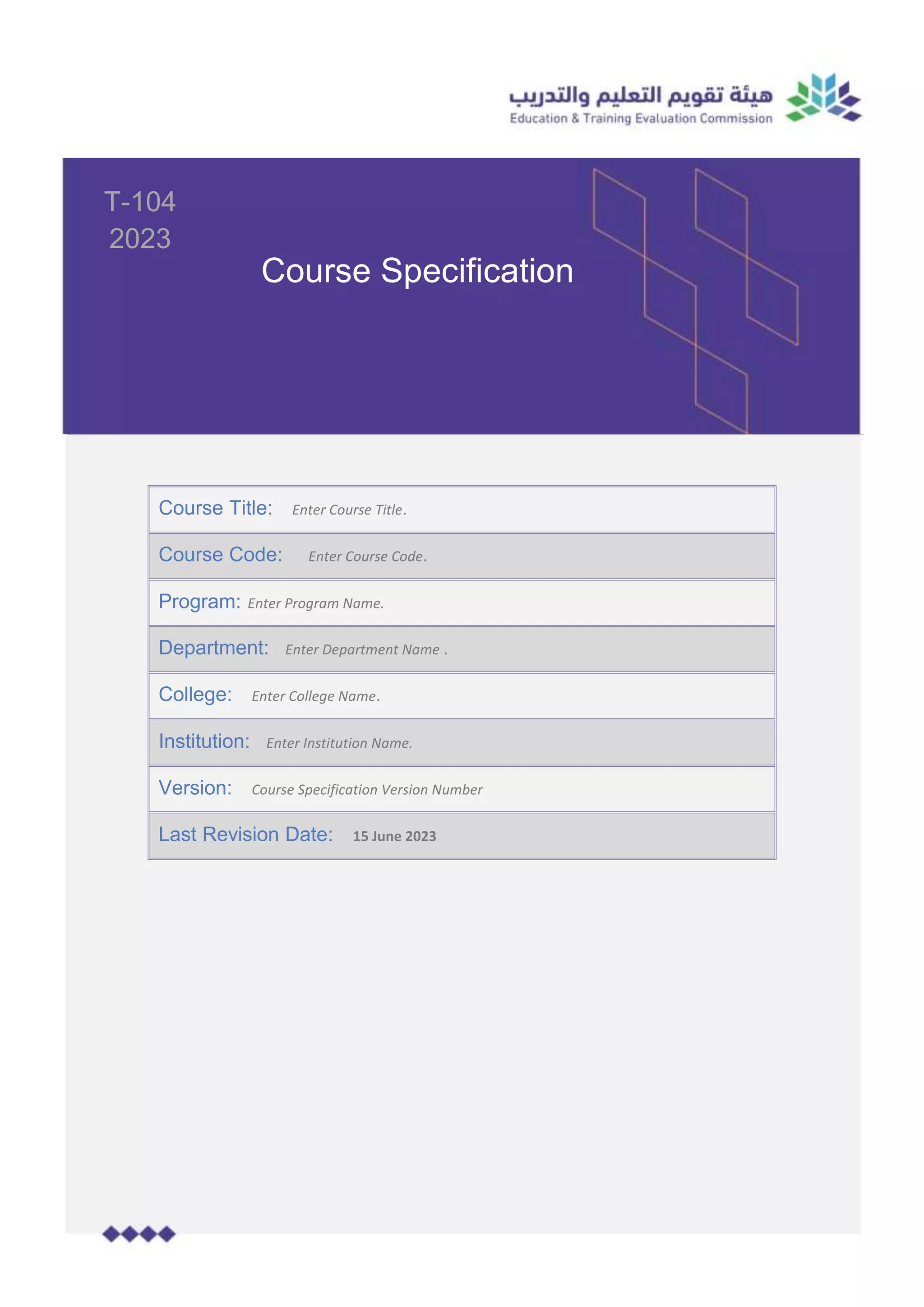 This document provides a course specification for an unspecified course, outlining general information about the course including contact hours, learning outcomes, teaching strategies, assessment methods, required resources and facilities, and procedures for assessing course quality. Details provided include the course title, code, associated program and department, pre-requisites, topics to be covered, and assessment activities and their timing. The specification is intended to standardize the course and subject it to approval and periodic review.