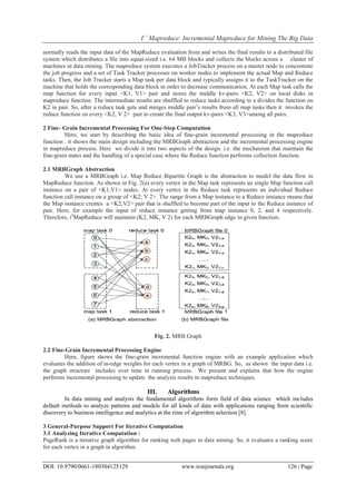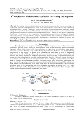 This document proposes i2MapReduce, a novel incremental processing expansion to the MapReduce framework for data mining big data. i2MapReduce executes fine-grained incremental processing at the key-value pair level to refresh mining results, unlike existing approaches that use task-level recomputation. It incorporates techniques to reduce I/O for accessing computation states. Experimental results on Amazon EC2 show i2MapReduce significantly improves performance over iterative and plain MapReduce that perform full recomputation when data changes.