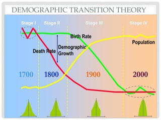 This document discusses Thomas Malthus's theory of population growth and its relationship to resource availability. It also discusses the Demographic Transition Theory and Esther Boserup's response to Malthus. Malthus argued that population grows geometrically while resources grow arithmetically, leading to population exceeding carrying capacity. Boserup countered that population pressure stimulates technological innovation to increase yields. The document also notes debates between anti-populationists concerned with limits and pronatalists who argue resources will become more abundant through technology.