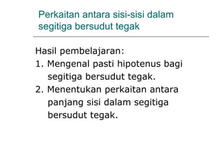 Dokumen ini membincangkan Teorem Pythagoras dan aplikasinya dalam menentukan panjang sisi segitiga bersudut tegak serta memberikan latihan berkaitan. Pembelajaran termasuk mengenal pasti hipotenus, mengukur panjang sisi, dan menyelesaikan masalah geometrik menggunakan teorem tersebut. Penggunaan teorem Pythagoras juga diterangkan untuk menentukan jenis segitiga dan sudut-sudutnya.