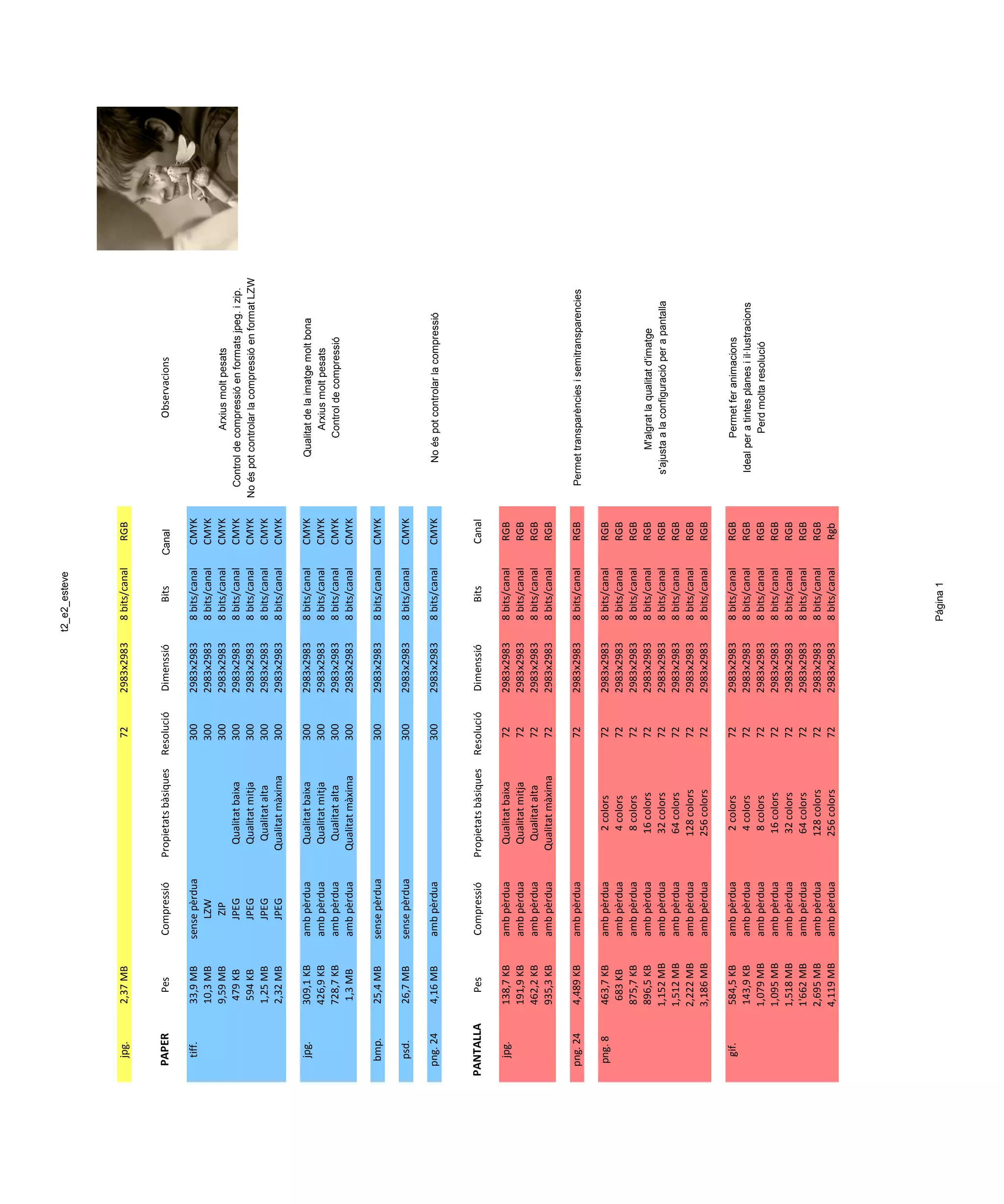 KB 728,7 KB 1,3 MB 25,4 MB 26,7 MB 4,16 MB Pes 138,7 KB 191,9 KB 462,2 KB 935,3 KB 4,489 KB 463,7 KB 683 KB 875,7 KB 896,5 KB 1,152 MB 1,512 MB 2,222 MB 3,186 MB 584,5 KB 143,9 KB 1,079 MB 1,095 MB 1,518 MB 1'662 MB 2,695 MB 4,119 MB jpg. bmp. psd. png. 24 PANTALLA jpg. png. 24 png. 8 gif. amb pèrdua amb pèrdua amb pèrdua amb pèrdua amb pèrdua amb pèrdua amb pèrdua amb pèrdua amb pèrdua amb pèrdua amb pèrdua amb pèrdua amb pèrdua amb pèrdua amb pèrdua amb pèrdua amb pèrdua amb pèrdua amb pèrdua amb pèrdua amb pèrdua sense pèrdua sense pèrdua amb pèrdua amb pèrdua amb pèrdua amb pèrdua 2 colors 4 colors 8 colors 16 colors 32 colors 64 colors 128 colors 256 colors 2 colors 4 colors 8 colors 16 colors 32 colors 64 colors 128 colors 256 colors Qualitat baixa Qualitat mitja Qualitat alta Qualitat màxima Propietats bàsiques Qualitat baixa Qualitat mitja Qualitat alta Qualitat màxima Qualitat baixa Qualitat mitja Qualitat alta Qualitat màxima 72 72 72 72 72 72 72 72 72 72 72 72 72 72 72 72 72 72 72 72 72 Resolució 300 300 300 300 300 300 300 300 300 300 300 300 300 300 33,9 MB 10,3 MB 9,59 MB 479 KB 594 KB 1,25 MB 2,32 MB tiff. sense pèrdua LZW ZIP JPEG JPEG JPEG JPEG Resolució Propietats bàsiques Pes PAPER Compressió 72 2,37 MB jpg. 2983x2983 2983x2983 2983x2983 2983x2983 2983x2983 2983x2983 2983x2983 2983x2983 2983x2983 2983x2983 2983x2983 2983x2983 2983x2983 2983x2983 2983x2983 2983x2983 2983x2983 2983x2983 2983x2983 2983x2983 2983x2983 Dimenssió 2983x2983 2983x2983 2983x2983 2983x2983 2983x2983 2983x2983 2983x2983 2983x2983 2983x2983 2983x2983 2983x2983 2983x2983 2983x2983 2983x2983 Dimenssió 2983x2983 Página 1 8 bits/canal 8 bits/canal 8 bits/canal 8 bits/canal 8 bits/canal 8 bits/canal 8 bits/canal 8 bits/canal 8 bits/canal 8 bits/canal 8 bits/canal 8 bits/canal 8 bits/canal 8 bits/canal 8 bits/canal 8 bits/canal 8 bits/canal 8 bits/canal 8 bits/canal 8 bits/canal 8 bits/canal Bits 8 bits/canal 8 bits/canal 8 bits/canal 8 bits/canal 8 bits/canal 8 bits/canal 8 bits/canal 8 bits/canal 8 bits/canal 8 bits/canal 8 bits/canal 8 bits/canal 8 bits/canal 8 bits/canal Bits 8 bits/canal t2_e2_esteve RGB RGB RGB RGB RGB RGB RGB Rgb RGB RGB RGB RGB RGB RGB RGB RGB RGB RGB RGB RGB RGB Canal CMYK CMYK CMYK CMYK CMYK CMYK CMYK CMYK CMYK CMYK CMYK CMYK CMYK CMYK Canal RGB Permet fer animacions Ideal per a tintes planes i il·lustracions Perd molta resolució M'algrat la qualitat d'imatge s'ajusta a la configuració per a pantalla Permet transparències i semitransparencies No és pot controlar la compressió Qualitat de la imatge molt bona Arxius molt pesats Control de compressió Arxius molt pesats Control de compressió en formats jpeg. i zip. No és pot controlar la compressió en format LZW Observacions