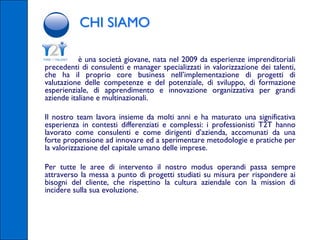Time2Talent è una società fondata nel 2009, specializzata nella valorizzazione dei talenti e nella gestione delle risorse umane attraverso progetti su misura per grandi aziende. Le aree di intervento includono strategie di HR, assessment delle competenze, formazione esperienziale e sistemi di recruiting online. Il team di esperti utilizza metodologie innovative per supportare le aziende nella definizione della cultura organizzativa e nell'evoluzione dei propri processi gestionali.