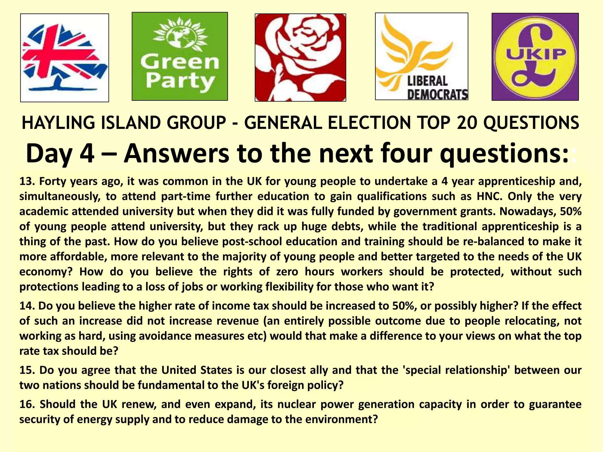 The document summarizes responses from three political candidates to a set of questions from the Hayling Island Group.
