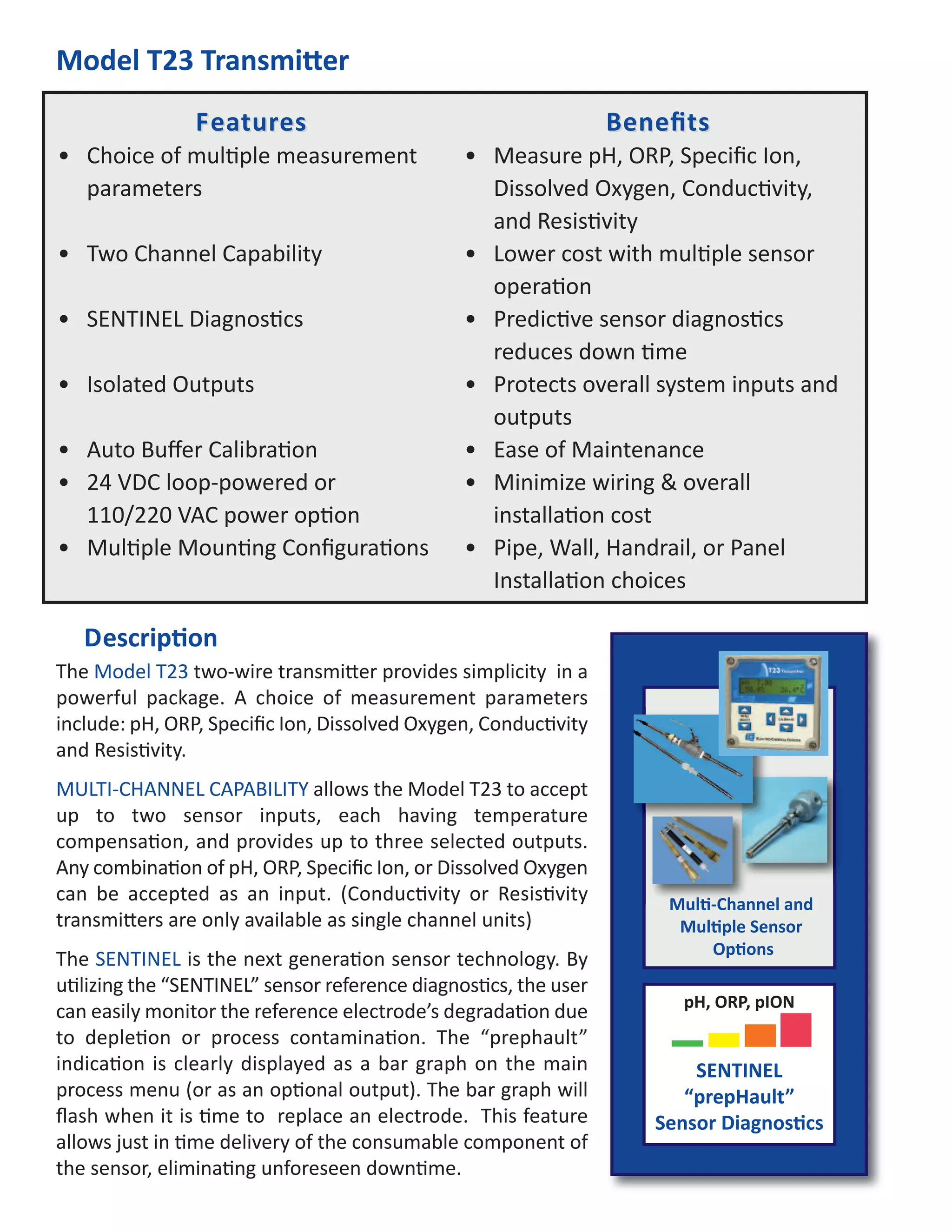 The Model T23 two-wire transmitter can measure pH, ORP, specific ions, dissolved oxygen, conductivity and resistivity using various sensors. It has multi-channel capability to accept up to two sensor inputs with temperature compensation and provides up to three isolated outputs. It features predictive sensor diagnostics to reduce downtime and auto buffer calibration for easy maintenance. Power options include 24VDC loop-powered or 110/220VAC with isolated outputs and optional outputs like PID control or relays.