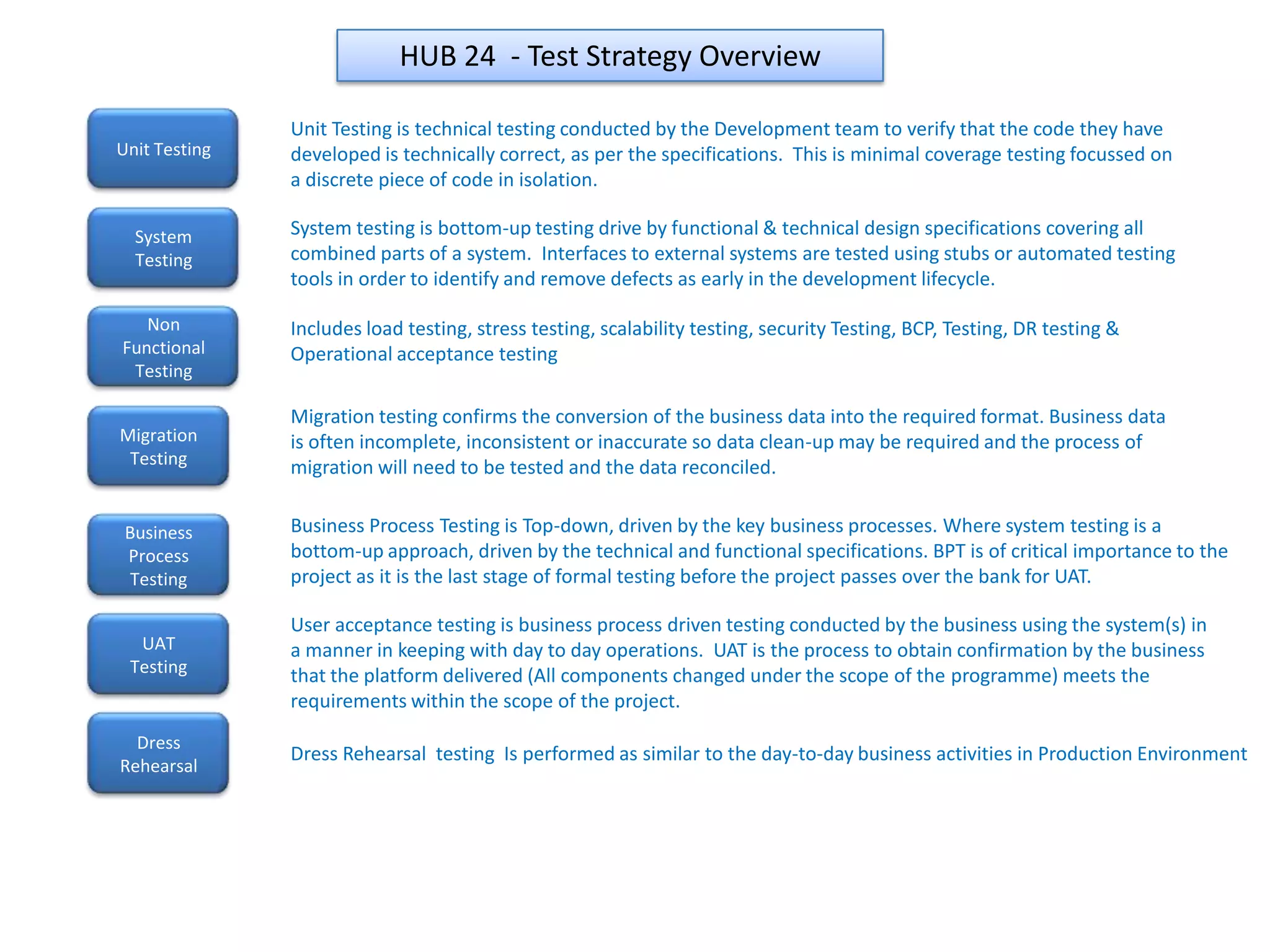 HUB 24 - Test Strategy OverviewUnit TestingUnit Testing is technical testing conducted by the Development team to verify that the code they have developed is technically correct, as per the specifications. This is minimal coverage testing focussed on a discrete piece of code in isolation.System TestingSystem testing is bottom-up testing drive by functional & technical design specifications covering all combined parts of a system. Interfaces to external systems are tested using stubs or automated testing tools in order to identify and remove defects as early in the development lifecycle.Non FunctionalTestingIncludes load testing, stress testing, scalability testing, security Testing, BCP, Testing, DR testing & Operational acceptance testing Migration testing confirms the conversion of the business data into the required format. Business data is often incomplete, inconsistent or inaccurate so data clean-up may be required and the process of migration will need to be tested and the data reconciled.Migration TestingBusiness Process Testing is Top-down, driven by the key business processes. Where system testing is a bottom-up approach, driven by the technical and functional specifications. BPT is of critical importance to the project as it is the last stage of formal testing before the project passes over the bank for UAT. Business Process TestingUser acceptance testing is business process driven testing conducted by the business using the system(s) in a manner in keeping with day to day operations. UAT is the process to obtain confirmation by the business that the platform delivered (All components changed under the scope of the programme) meets the requirements within the scope of the project. UATTestingDressRehearsalDress Rehearsal testing Is performed as similar to the day-to-day business activities in Production Environment
