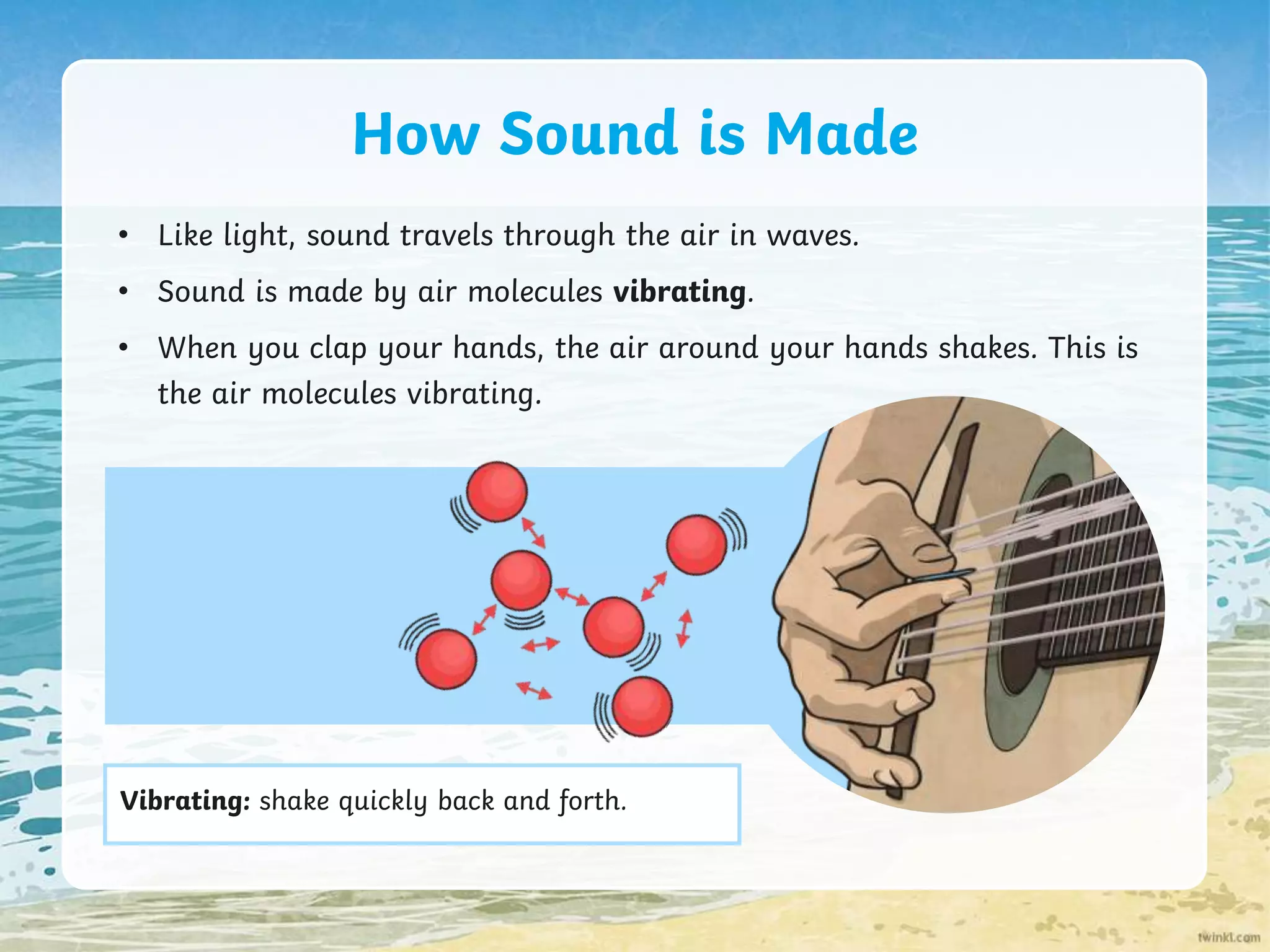 Sound is made by air molecules vibrating when an object like hands clap together. These vibrations move through the air as waves, causing nearby air molecules to vibrate and pass the vibration along, until it reaches the ear. In the ear, the vibrations cause tiny hairs connected to nerves to shake, which then send signals to the brain so it recognizes the sound. Sound travels through other materials like water and metal faster than through air by vibrating molecules closer together.