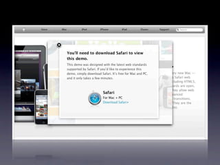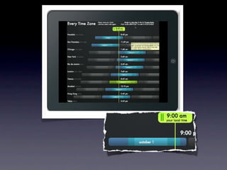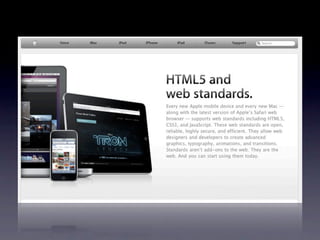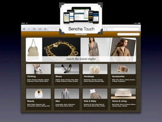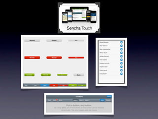 This document discusses designing multi-touch interfaces for HTML5 applications. It covers challenges like flexible layouts for different screen sizes and orientations, implementing common gestures, performance optimization, and cross-browser compatibility. Frameworks can help address these challenges. The conclusion recommends HTML5 for small applications and native solutions for large, feature-rich responsive apps.