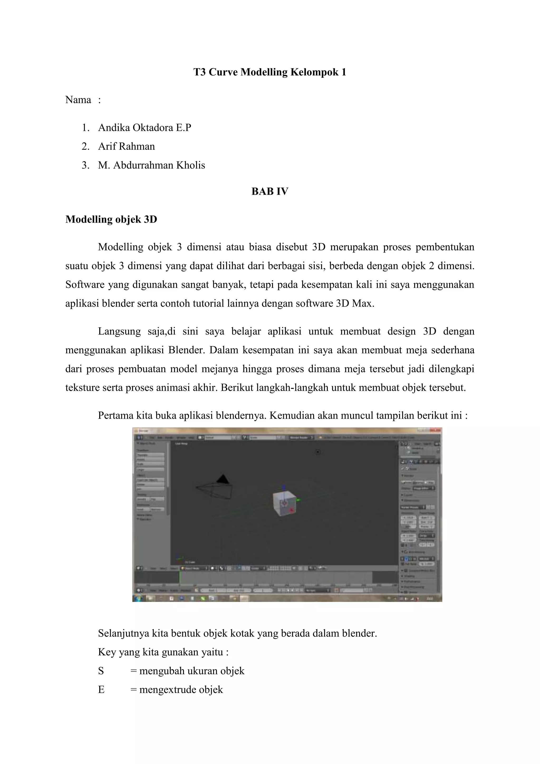 Dokumen tersebut membahas proses pemodelan objek 3D dengan menggunakan aplikasi Blender dan 3Ds Max. Langkah-langkah pemodelan objek 3D meliputi pembuatan meja, lampu, dan pesawat terbang dengan menambahkan tekstur, animasi, dan cahaya."