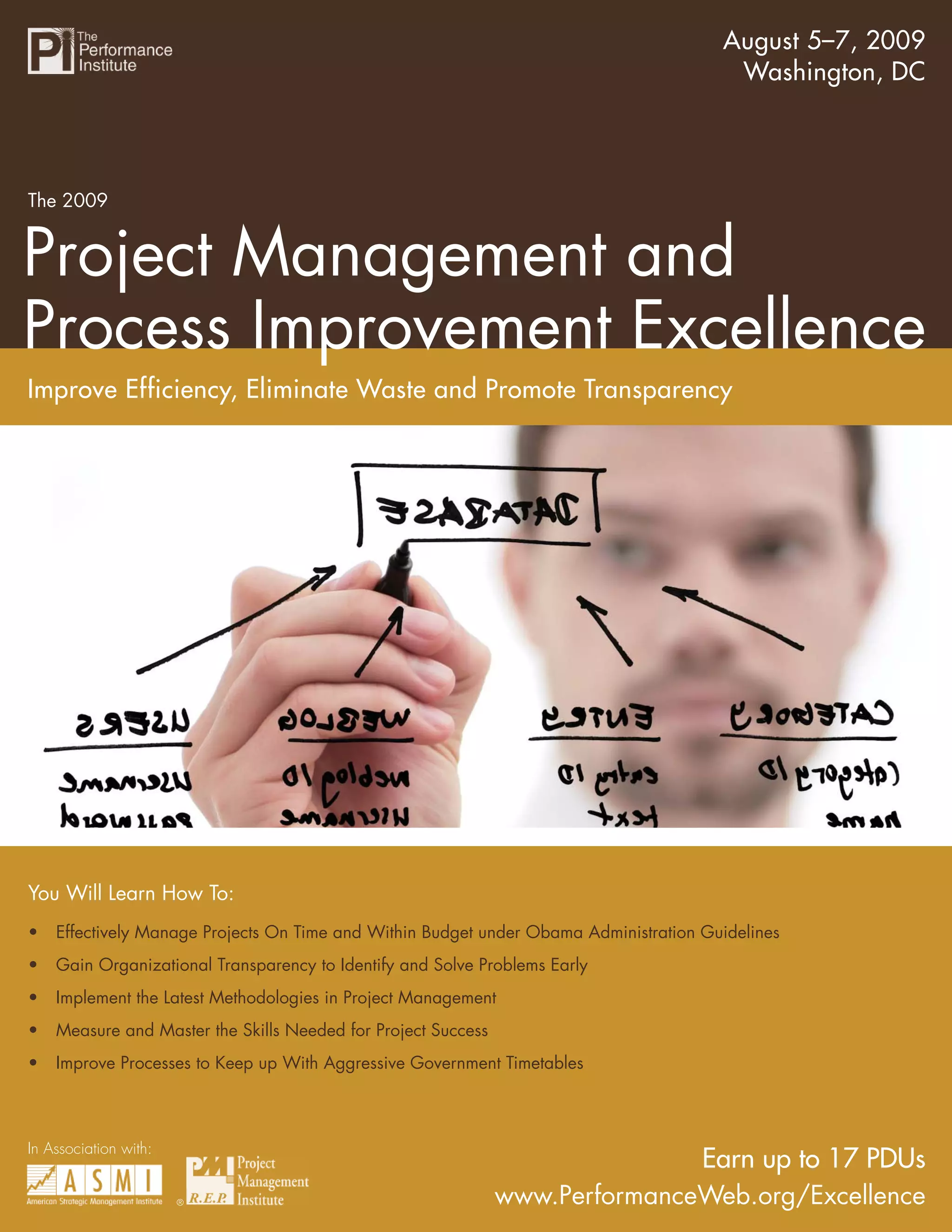 The 2009 Summit on Project Management and Process Improvement Excellence will take place August 5-7, 2009 in Washington, DC. The summit will provide training on project management, process improvement, and Lean Six Sigma through keynote speeches and workshops. Attendees will learn how to effectively manage projects, improve organizational transparency, and implement the latest methodologies. The agenda includes workshops on project management in government and Lean Six Sigma certification. The summit aims to teach attendees how to improve efficiency, eliminate waste, and promote transparency in their organizations.