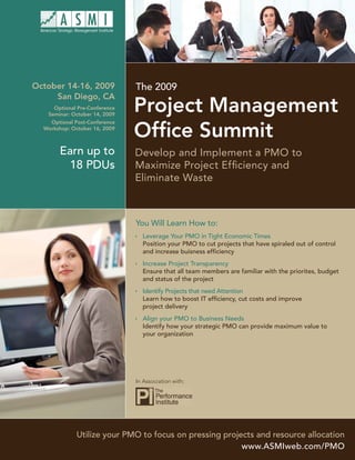 This document provides information about an upcoming Project Management Office (PMO) Summit to be held from October 14-16, 2009 in San Diego, CA. The summit will include an optional pre-conference seminar on implementing a PMO, a two-day conference covering various topics related to leveraging a PMO, and an optional post-conference workshop on advanced PMO techniques. Attendees can earn up to 18 professional development units. The document provides an agenda, speaker and session details, logistics and registration information.