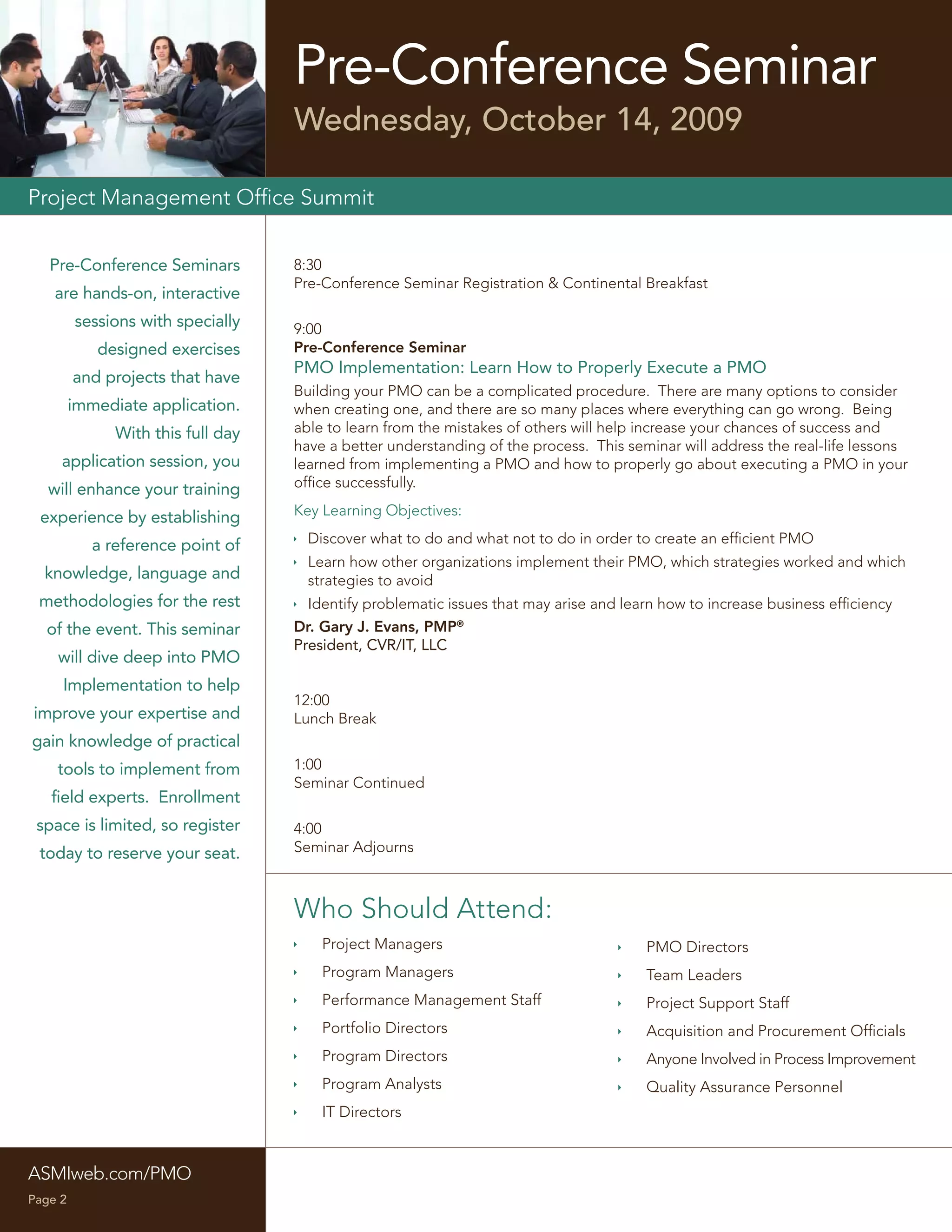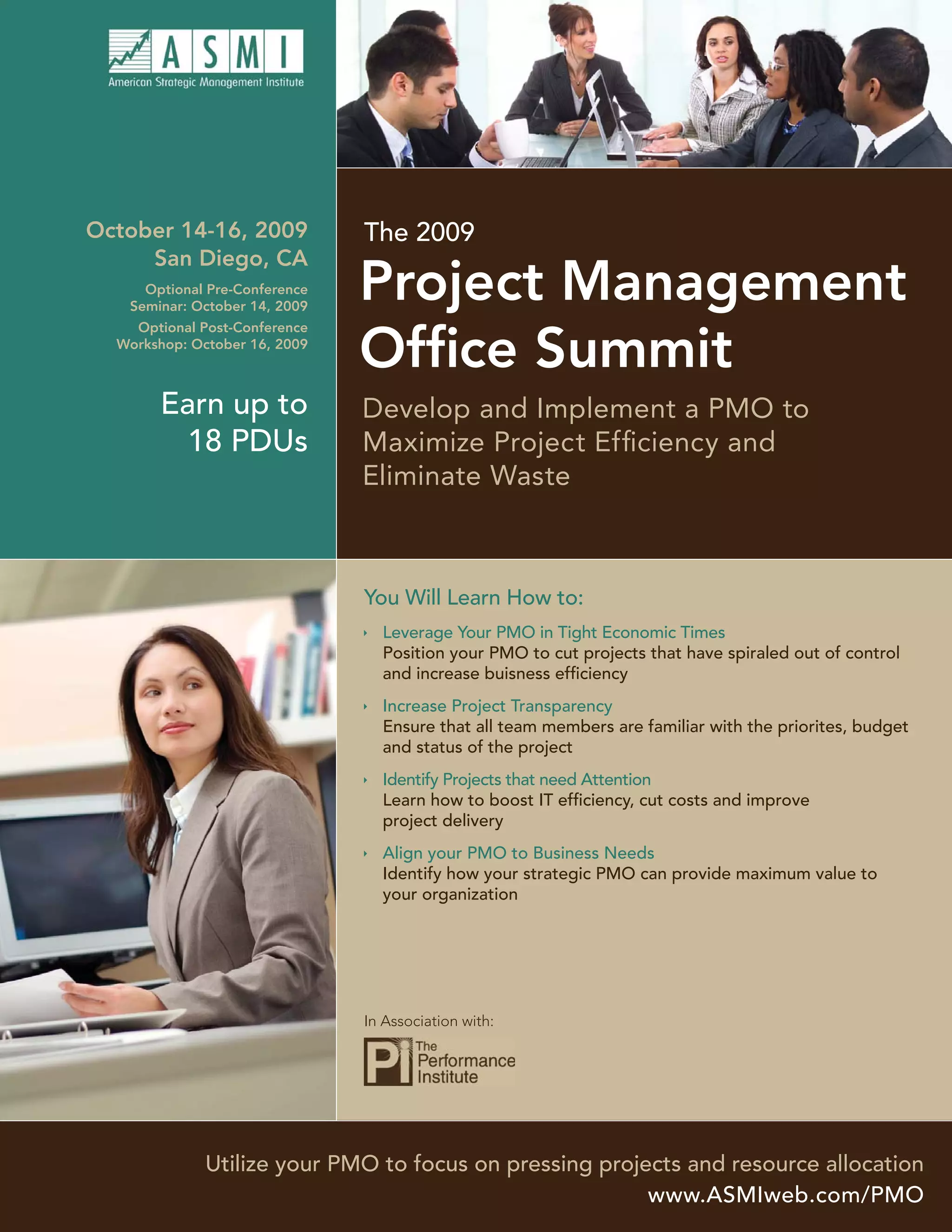 This document provides information about the 2009 Project Management Office Summit taking place from October 14-16, 2009 in San Diego, CA. The summit will include an optional pre-conference seminar on October 14 about implementing a PMO, and an optional post-conference workshop on October 16 about energizing project portfolio management. The two-day conference will focus on developing a business case for a PMO, building a world-class PMO, project portfolio management, marketing a PMO internally, creating an enterprise PMO, developing PMO measures and mitigating risk with a PMO. Presenters will provide strategies and case studies. Participants can earn up to 18 PDUs. In-house training and sponsorship opportunities are also described