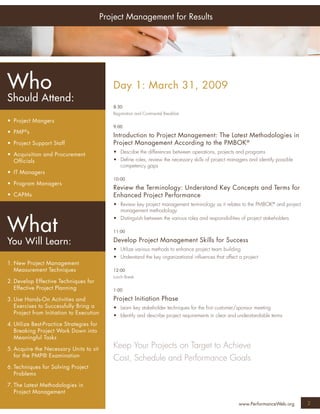 The 4-day training workshop titled "Project Management for Results" will be held from March 31 to April 3, 2009 in Las Vegas, NV. Attendees will learn new project management techniques including project planning, scheduling, budgeting, risk management, and closing processes. Topics will help participants effectively initiate and execute projects on time, on budget and within scope to achieve goals.