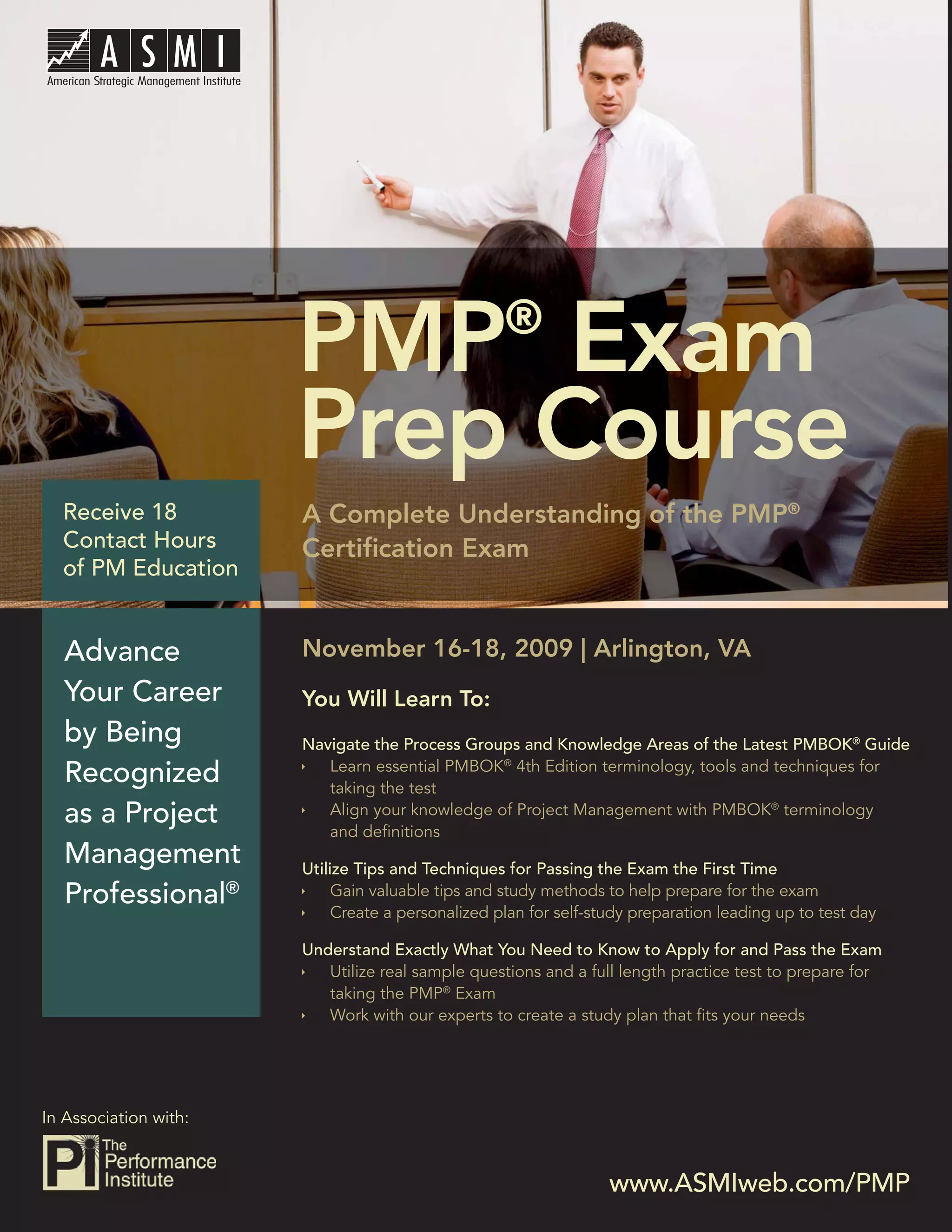 The document provides information about a 3-day PMP® Exam Prep Course taking place from November 16-18, 2009 in Arlington, VA. The course will provide 18 contact hours of project management education to help students learn the concepts needed to pass the PMP® exam. Students will learn about the five process groups, nine knowledge areas, essential terms and techniques. They will gain tips for exam preparation and practice real exam questions.
